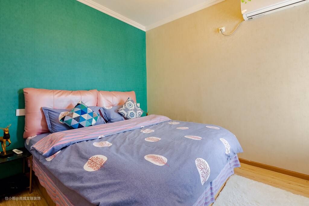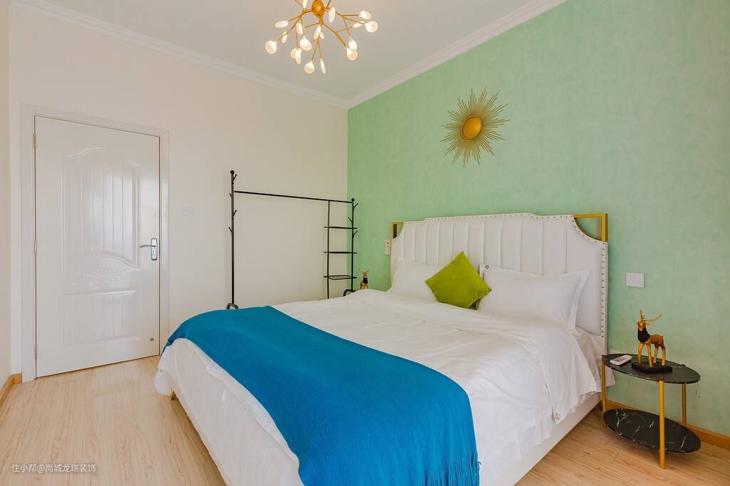 主卧在色彩搭配和细节设计上延续了空间节约的风格,但在墙面通过大胆的撞色来为空间增添一丝活泼的气息。柔软舒适的床垫,感受清新空间的美感,仿佛时光都被停滞,享受来之不易的安宁。
