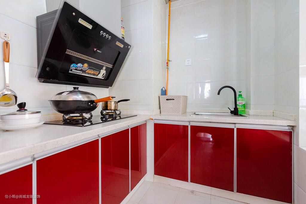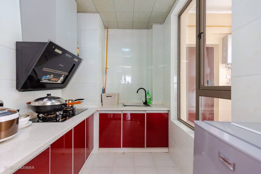 为了提升厨房的采光,在墙面的一侧做了镂空玻璃窗,有效的提升空间整体的通透感,深红色的橱柜不仅高级还能有效的提升整体的储物能力,让业主在享受烹饪的同时还能去享受家人的陪伴。