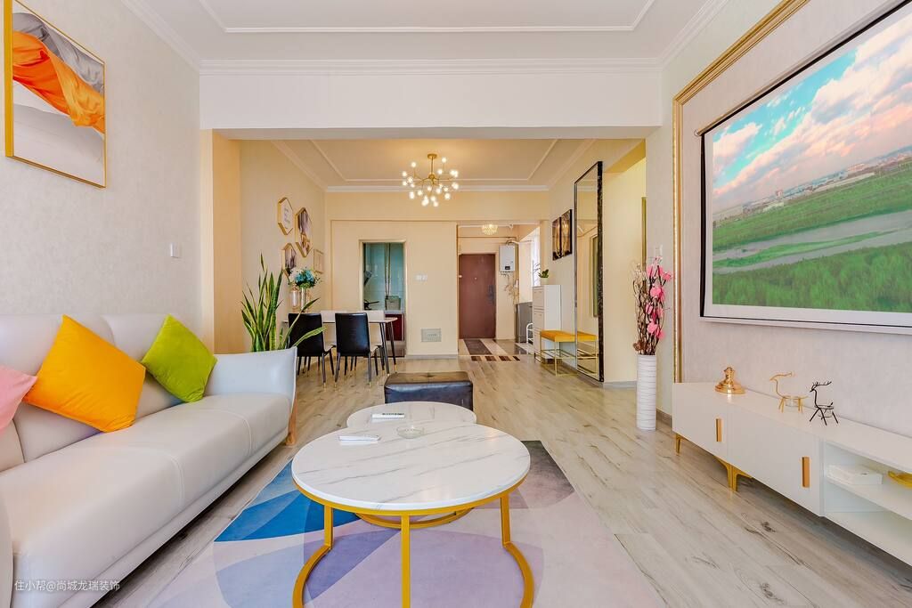 在客厅的设计上,并没有对灯具、背景墙纸类做太多太复杂的设计,没有选择华丽的灯光,而是通过简约的设计保证空间的通透感,增强视觉效果,提升空间感。