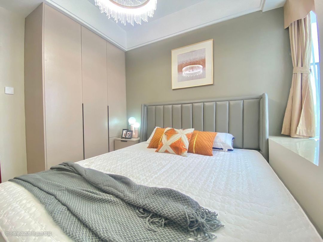 卧室的设计温暖舒适,顶部的吊灯带来精致的空间氛围,定制的柜子做的到顶的设计,增加空间的收纳面积。