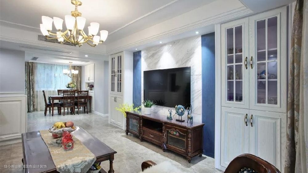 客厅里电视背景墙两边各有一列柜子,中间使用白色大理石和蓝灰色绒面硬包,既增加了了储物功能,视觉上也美观;因为是地暖房,瓷砖的导热性比较好,也有更好的耐磨性,所以选择铺地砖;沙发后面以白色实木护墙板为主,上方是淡蓝色墙面,看上去简洁舒服。