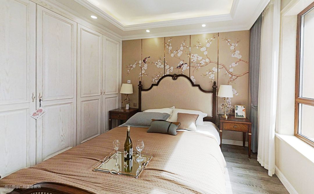卧室的墙面选用了国画风格的墙纸,床体的框架结构也是特点鲜明的南洋风,中西方文化在这个空间里不断的交融,彼此之间相辅相成,紧贴“中西合璧”的设计主题。