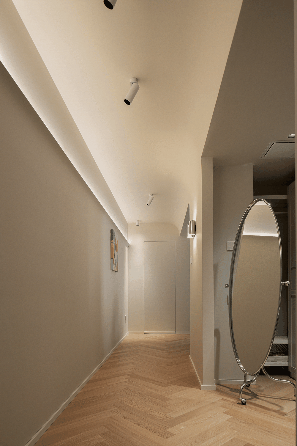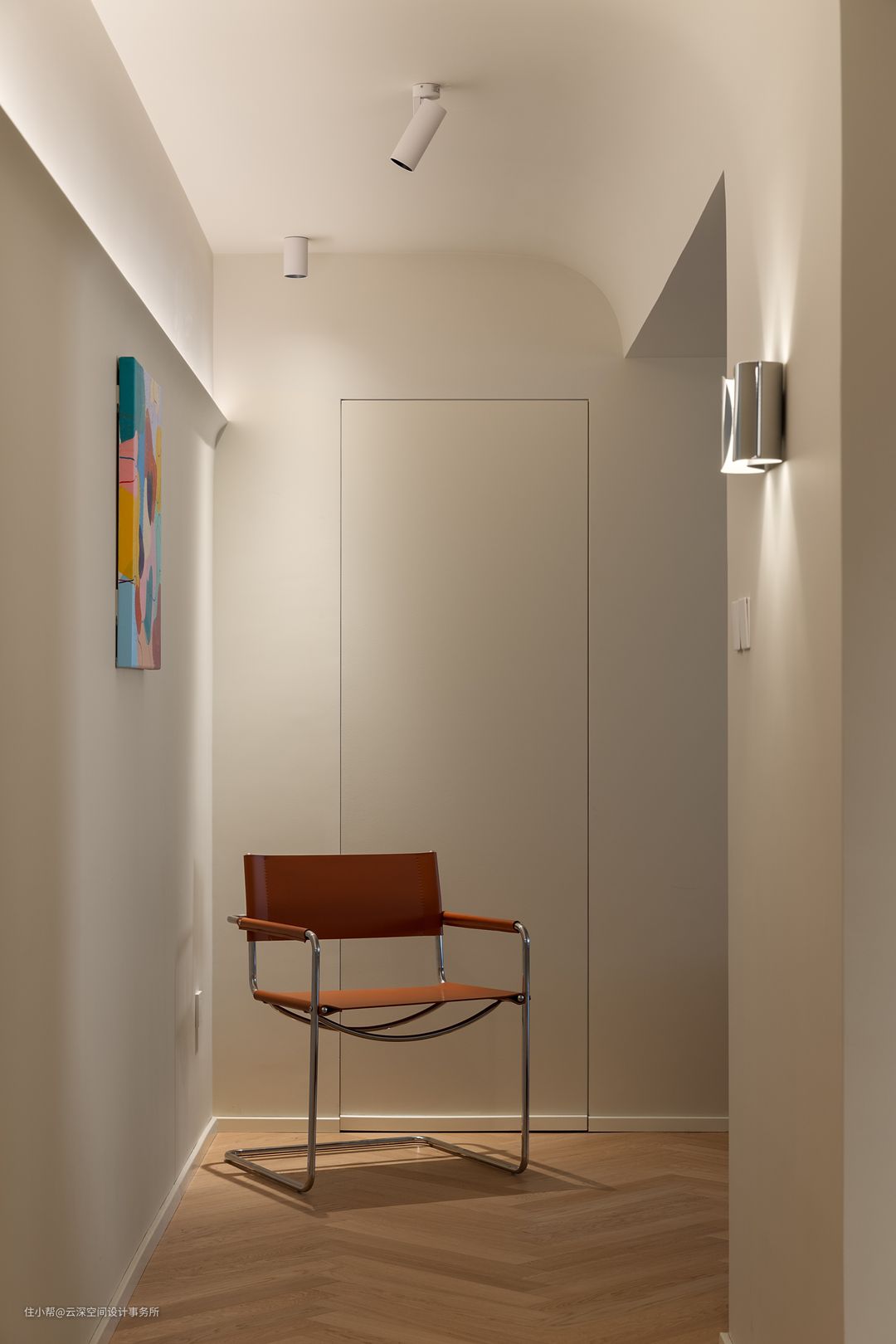 改造后,将走廊右侧非承重墙体拆除,走廊尽头墙面拆除后前移新砌墙体;将空间进行横向扩充和竖向缩短,视觉和光线得到最大释放,局部弧线造型让空间更加温柔;同时通过射灯、局部筒灯以及壁灯打造出不同层次的光影效果; #轻法式 #奶油系 #无主灯设计 #走廊 #隐形门 #装饰画