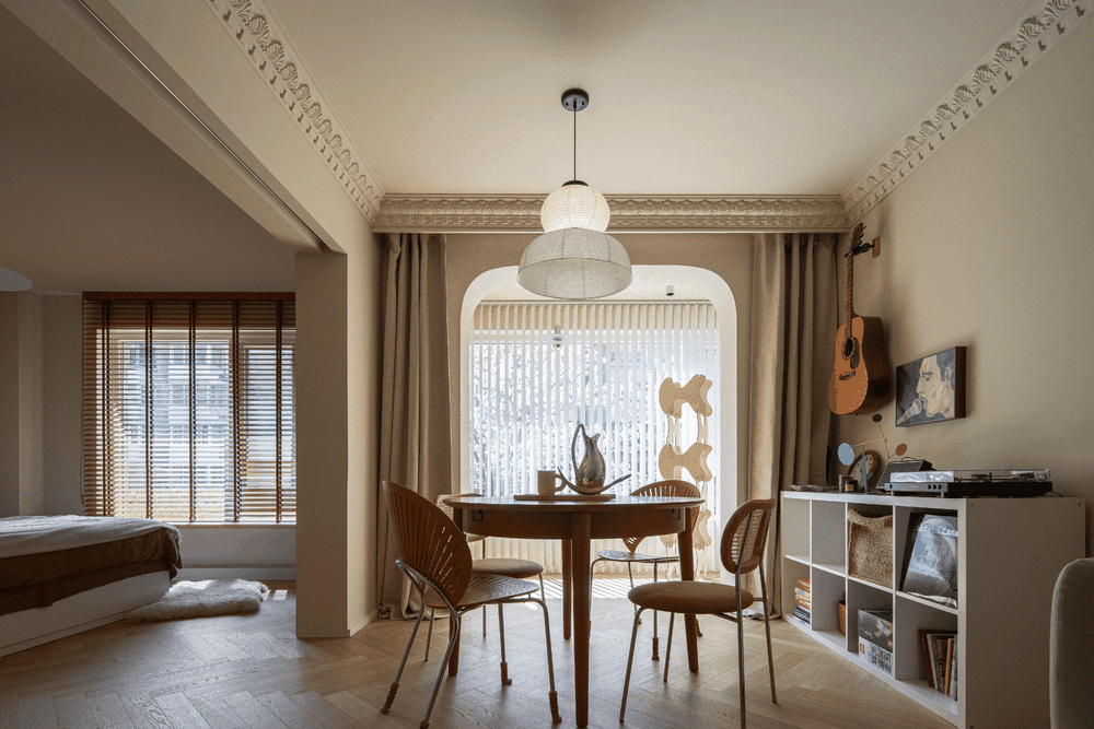改造后,原本的卧室被规划为开放式的客餐厅区域;整体奶咖色基调让整体空间慵懒随性,搭配精致的法式石膏线条,多了一份生活的仪式感; 通过自带复古氛围的白色边框水波纹玻璃移门连接客餐厅与卧室,带来不一样的使用感受和视觉感受;开门,空间贯通;门合,光影旖旎。 #轻法式 #奶油系 #客餐厅 #水波纹 #边柜 #法式线条 #拱形门洞