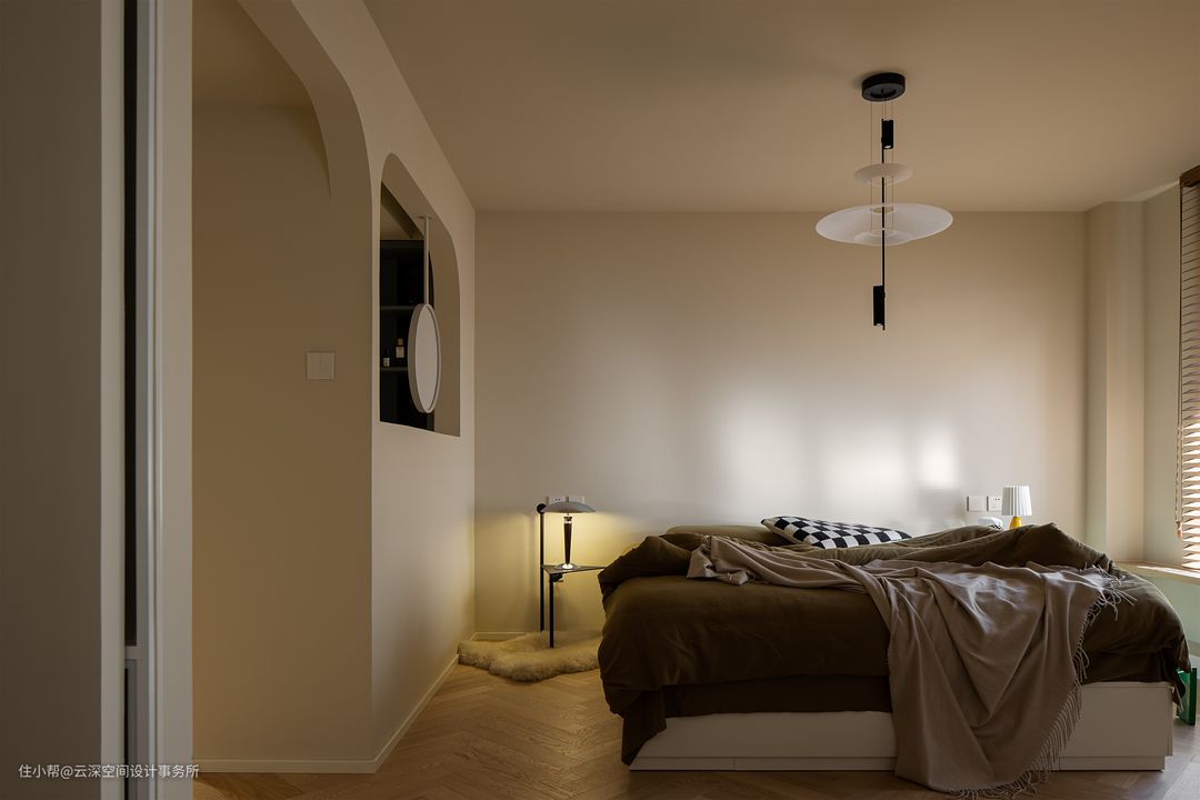 床头正对的墙面设计壁龛,壁龛一侧墙体做1/4圆弧弧形造型,柔和线条充满艺术气息; #轻法式 #奶油系 #壁龛 #弧形 #法式线条