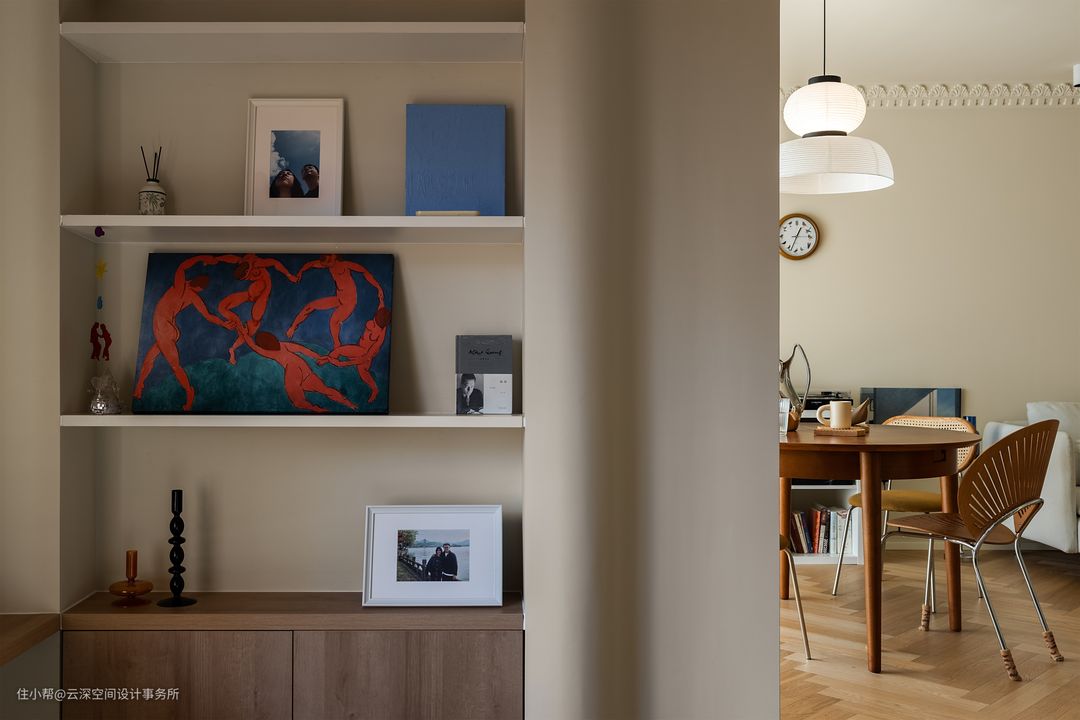 沙发背景墙一侧嵌入式壁龛设计巧思:因为客厅没有太多的储物空间,我们拆除了原始非承重墙体,内推新建墙体,巧妙地将定制开放式隔断嵌入其中。完美的满足了客厅收纳不足的需求; #轻法式 #客厅 #无主灯设计 #壁龛 #软装搭配 #木地板 #装饰画