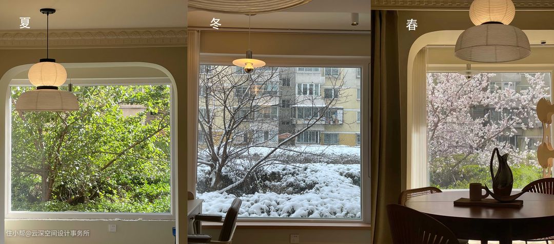 案例整体最吸睛的莫过于阳台的窗景,以窗为画框,感知四季;让人想起日本艺术家奈良美智的窗,春夏秋冬每个季节都是一副流动变幻着的风景画; #轻法式 #奶油系 #客餐厅 #水波纹 #边柜 #法式线条 #拱形门洞 #窗景