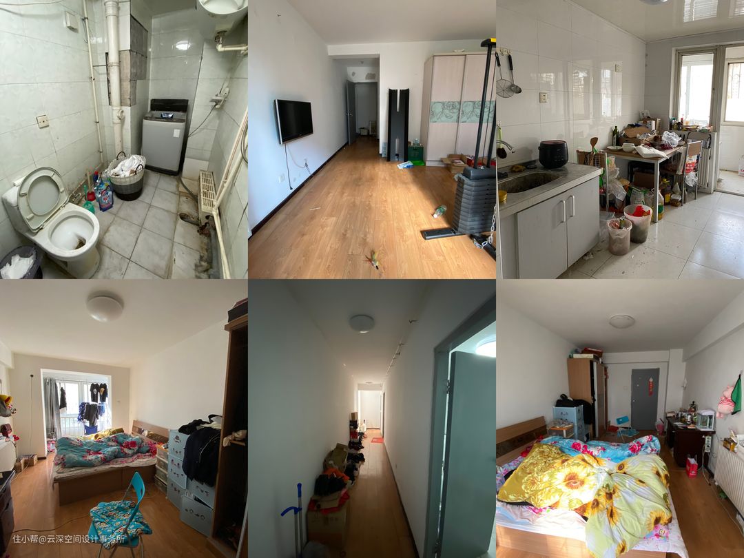 改造前,原始户型存在的问题: 1、原始户型有一个又黑又窄且没有光线的走廊,走廊空间没有被合理利用完全被浪费; 2、原始格局不设客餐厅,走廊的两端连接着厨房和两间卧室,动线过长; 3、原始格局有两个卫生间且都是暗卫。