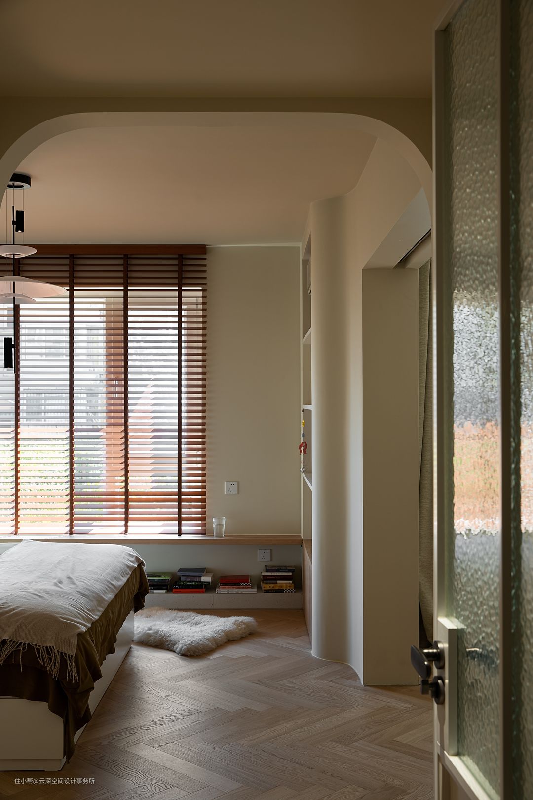 利用阳台下方,新建100mm地台,沿窗做木质隔断,隔断下方可放置书籍;在明媚的阳光下阅读一本书籍,享受生活的慢节奏; #轻法式 #卧室 #床品 #吊灯 #床边柜 #木地板 #地毯 #百叶窗