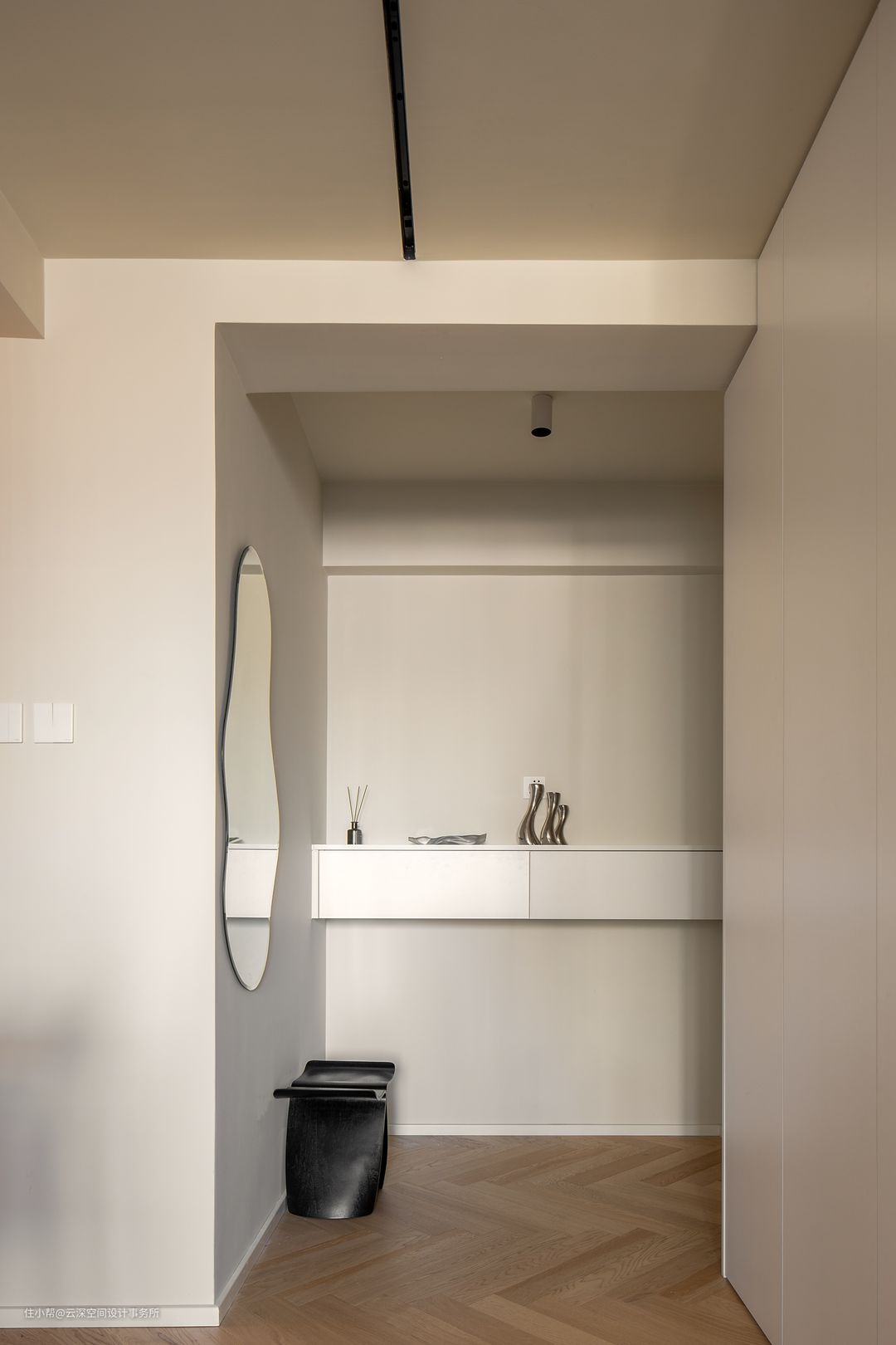 玄关空间较小且都是承重墙,没有办法拓宽,通顶玄关收纳柜会让玄关处非常压抑;弱化储物功能,只在一侧定制悬挂储物台案内藏储物空间,保持活动空间开阔,视线内也非常整洁; #轻法式 #玄关 #异性镜子 #奶油系 #软装摆件