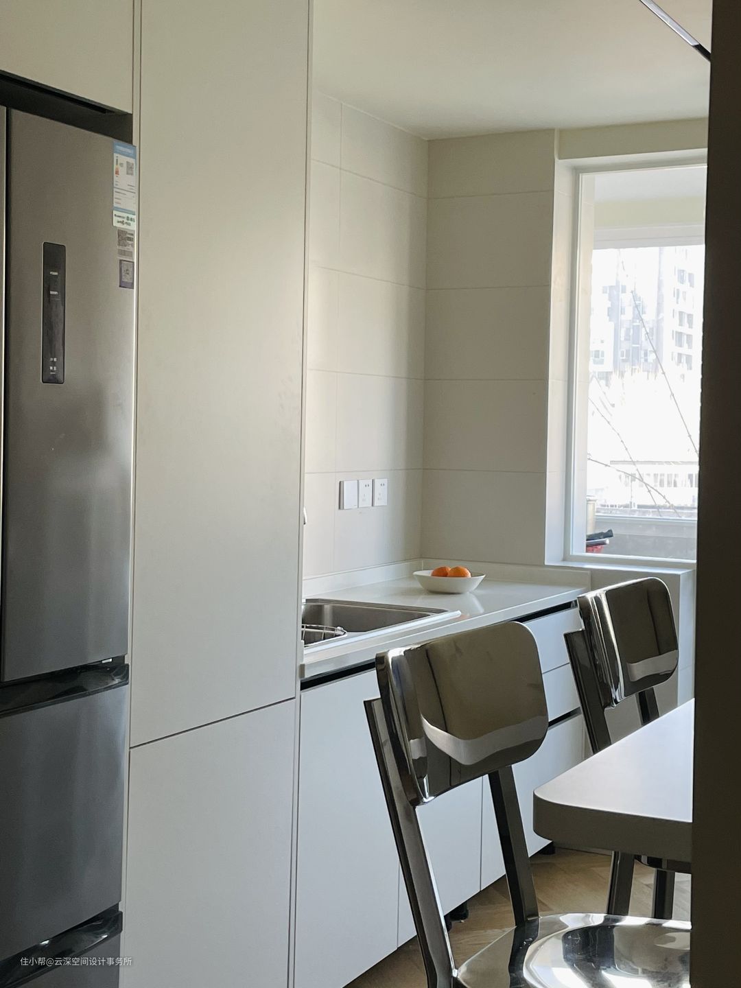 进门右侧是厨房,开放式的布局使空间散发着柔和通透的空灵感,厨房一侧迷你吧台搭配拉丝不锈钢高脚椅,搭配整体的奶咖色主调INS风拉满,在这里吃一顿早餐舒适惬意;阳台通过白色边框玻璃门相连,作为中厨烹炒区,避免油烟弥漫; #轻法式 #奶油系 #中西餐厨 #吧台 #轨道射灯