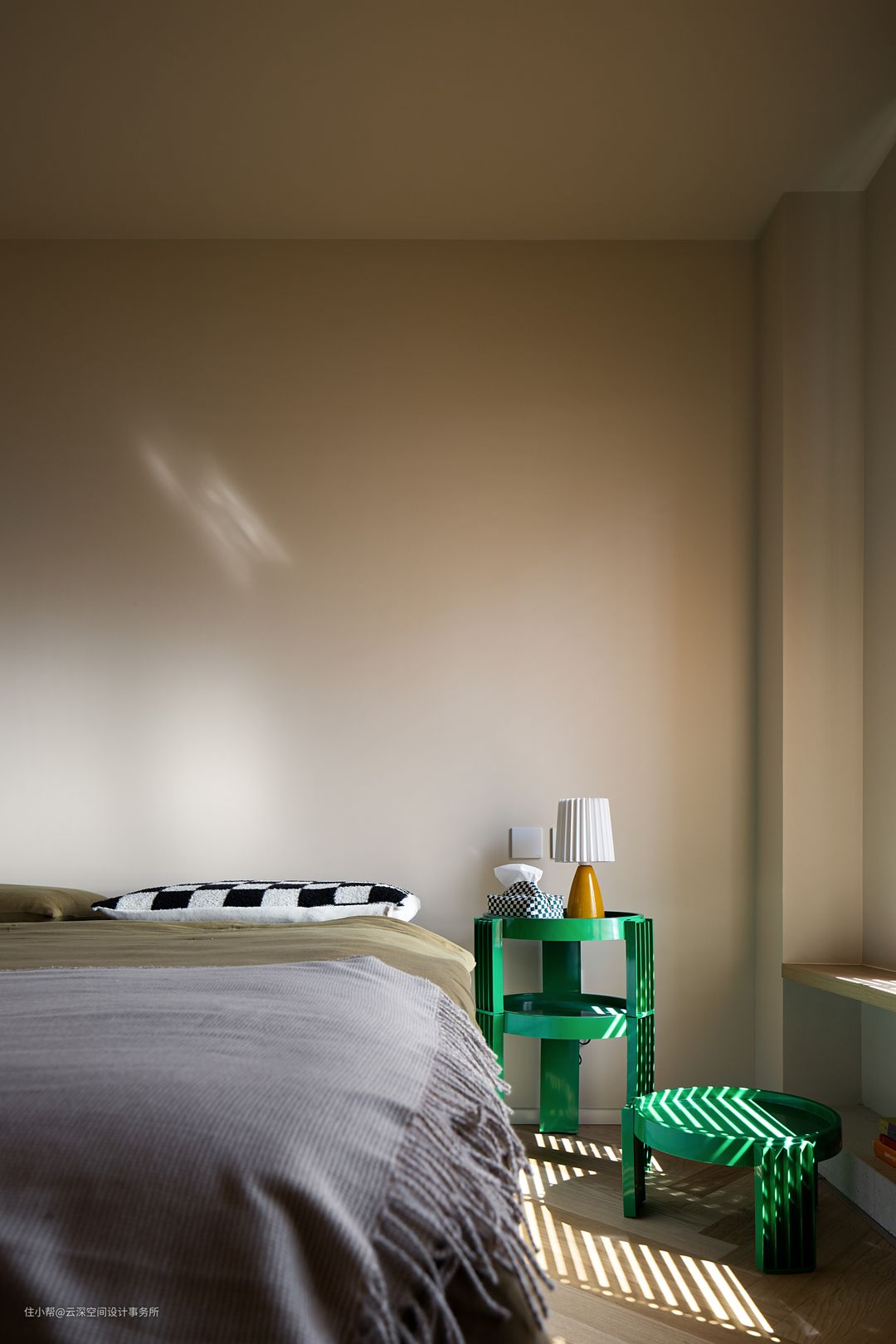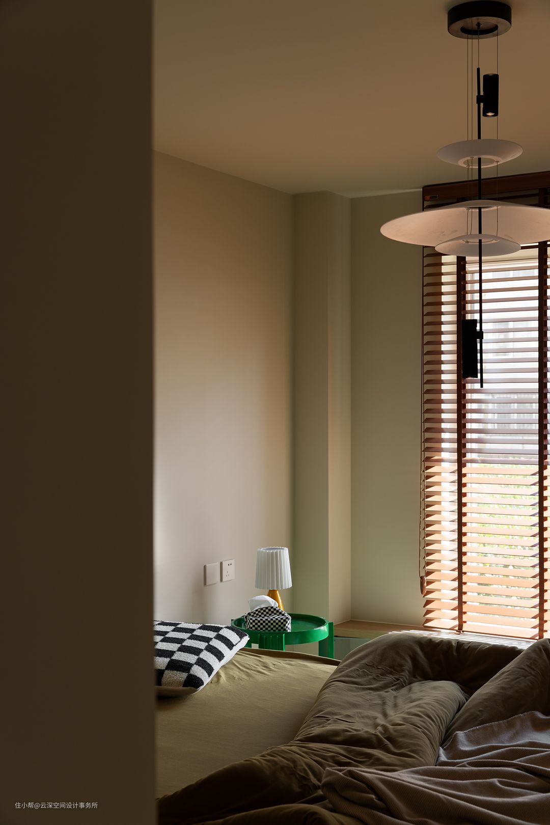 绿色的边几床头柜将时尚感拿捏,百叶窗折射出的光线感打造出家中绝美一角; #轻法式 #卧室 #床品 #吊灯 #床边柜 #木地板 #地毯