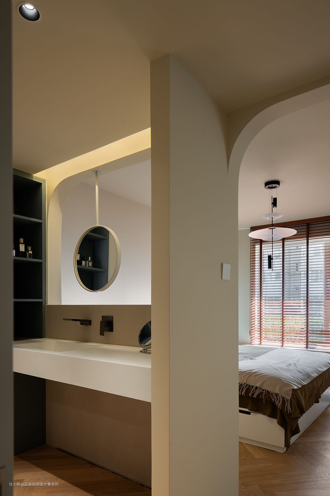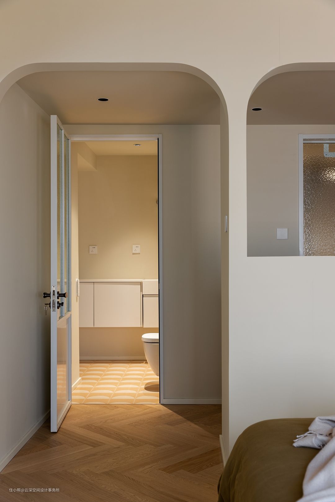 主卫我们设计成酒店套间的形式:主卧与半开放式卫生间直接贯通,两个拱形洞口设计让空间层次更加丰富,更加有“趣”味性; #请法式 #奶油系 #拱形门洞 #卫生间 #卫生间四分离 #卧室 #水波纹