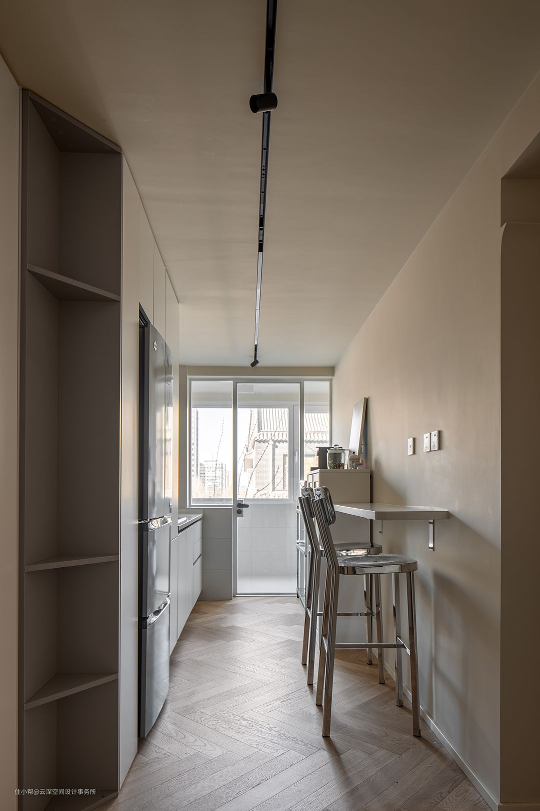 改造后,优化平面布局: 1、玄关面积紧凑,在布局上设计了全身镜和换鞋凳,仅用作出门前整理仪容,靠墙一侧定制上墙悬空定制柜,一定程度弥补收纳遗憾;悬空柜下可增加开放式鞋架,方便进户换鞋; 2、厨房利用阳台做了中西厨分区,加装玻璃隔断门,避免炒菜油烟过大,弥漫到其他空间;西餐利用过道宽度设一排窄边储物并加摆台,可作为早餐就餐使用; 3、考虑业主朋友来访频率,优先保证业主使用方便程度,所以保留一个卫生间即可;将靠走廊一侧的卫生间根据业主需求改造为衣帽间,满足进门后的次净衣和出门前的换衣需求,同时靠近玄关可以弥补玄关储物需求; 4、走廊尽头人为缩短,走廊尽头原始墙面拆除,前移新建墙面预留门洞;拆除原始结构全部非承重墙体,增加自然光进光面,再通过灯光层次、造型弱化狭窄感觉; 5、原始户型有两个卧室,将靠走廊的卧室规划为客餐厅区域,另一间规划为主卧;拆除连接两个空间的非承重墙体,通过超大尺寸银波纹玻璃移门相连,最大程度保证了卧室的私密性和整体空间的采光性; 6、保留的卫生间做了四分离设计:马桶区-洗漱区-淋浴区-家政区,三个空间独立、互不打扰;马桶区从主卧和走廊尽头做了双入门设计,走廊尽头门洞作为客人拜访时使用,卧室内门洞作为业主日常使用。 7、原始户型有超多梁且高矮不一,所有梁全部重新校队,再通过造型、灯光进行梁的弱化。