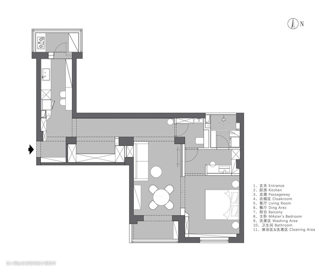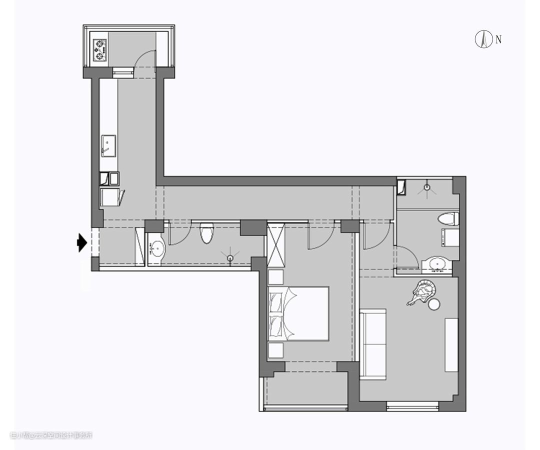 改造前,原始户型存在的问题: 1、原始户型有一个又黑又窄且没有光线的走廊,走廊空间没有被合理利用完全被浪费; 2、原始格局不设客餐厅,走廊的两端连接着厨房和两间卧室,动线过长; 3、原始格局有两个卫生间且都是暗卫。
