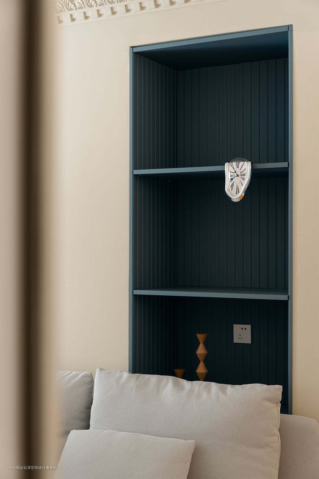 壁龛内部抽缝儿设计搭配深蓝色,营造出一个具有包裹感的盒子空间,视觉与功能井然有序的巧妙结合; #轻法式 #客厅 #无主灯设计 #壁龛 #软装搭配 #木地板 #装饰画