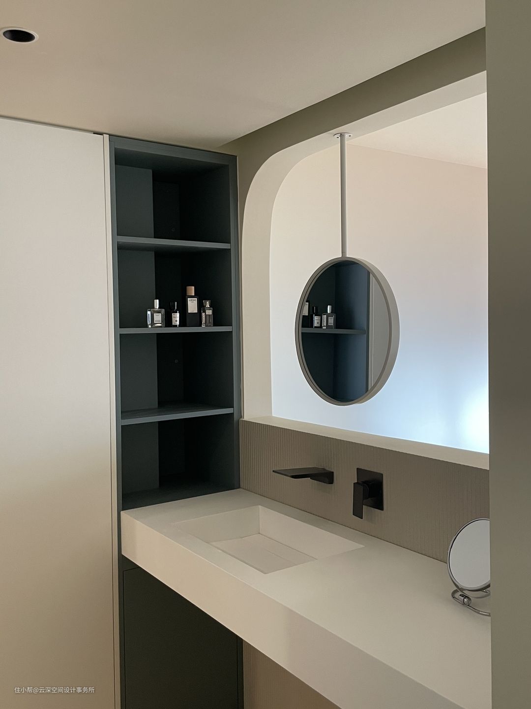 一侧的开放式隔断增加洗漱区收纳同时又与客厅壁龛形成呼应; #轻法式 #奶油系 #卫生间四分离 #洗漱区 #一体式台盆 #拱形门洞 #暗藏式水龙头
