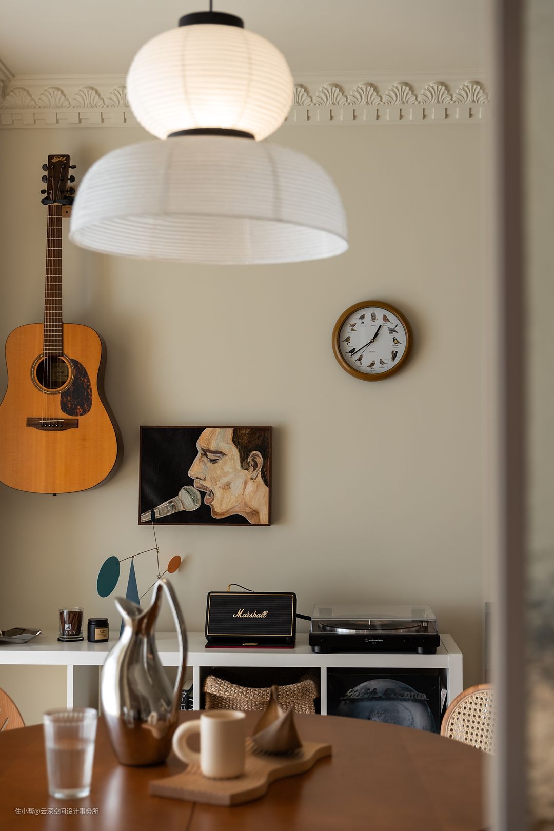 吉他、留声机、艺术装饰画...艺术氛围与家的温馨相互融合,在室内空间产生共鸣; 同时,围绕温润木质餐桌形成游洄动线,空间动线得到最大优化; #轻法式 #奶油系 #客餐厅 #水波纹 #边柜 #法式线条 #餐厅 #餐桌