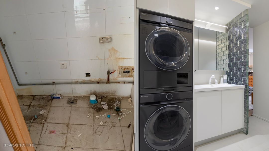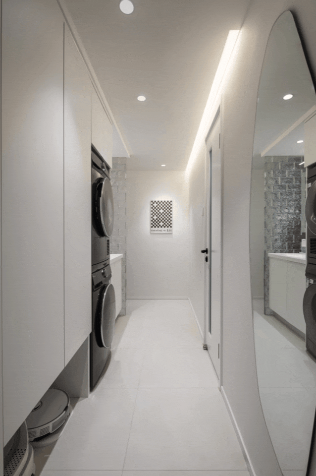 狭长走廊暗藏玄机,左侧依次是家政收纳柜、扫地机器人、洗衣机烘干机叠放和干区洗漱台。
