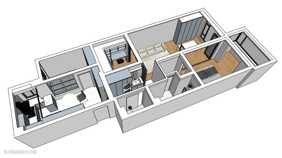 从最初满足二人世界的舒适性到未来有了孩子、和老人一起居住的功能需求,故依然保留了三居室,且实现了内、外双卫的功能。 黄色轴线处是承重墙,将整个房屋分为南北两个空间。 北向空间,在满足次卧是1.5m*2m的床位的基础上,墙体做了拆改,扩大了餐厨空间,玄关位置更方便。 南、北向空间,通过功能性走廊做衔接。 南向空间,为蓝色框标注的大套间,依次包含了多功能性书房、起居空间、开放式阅读区、主卧室、衣帽间和干湿分离的内卫。