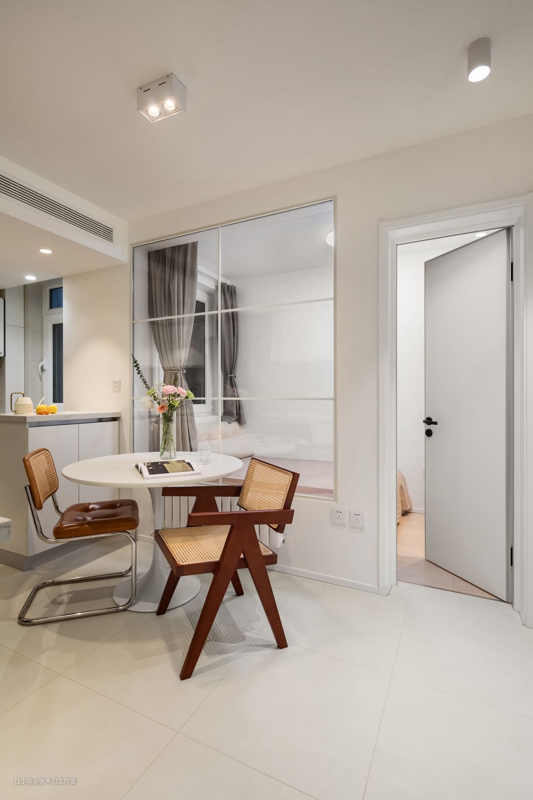 玄关与走廊之间,运用隐藏式吊轨门,隔绝餐厨的油烟问题。