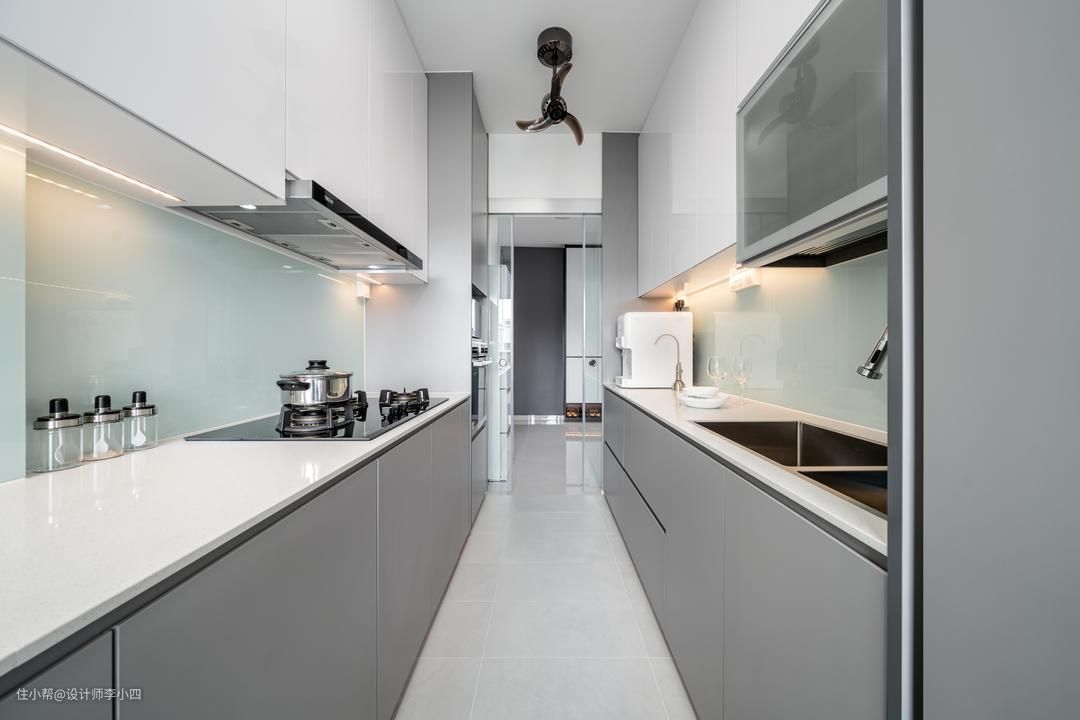 厨房内做双一字型橱柜,灰色的地柜和白色吊柜设计,可收纳大量餐厨用具。吊柜下方安装有辅灯,为操作区带来照明。