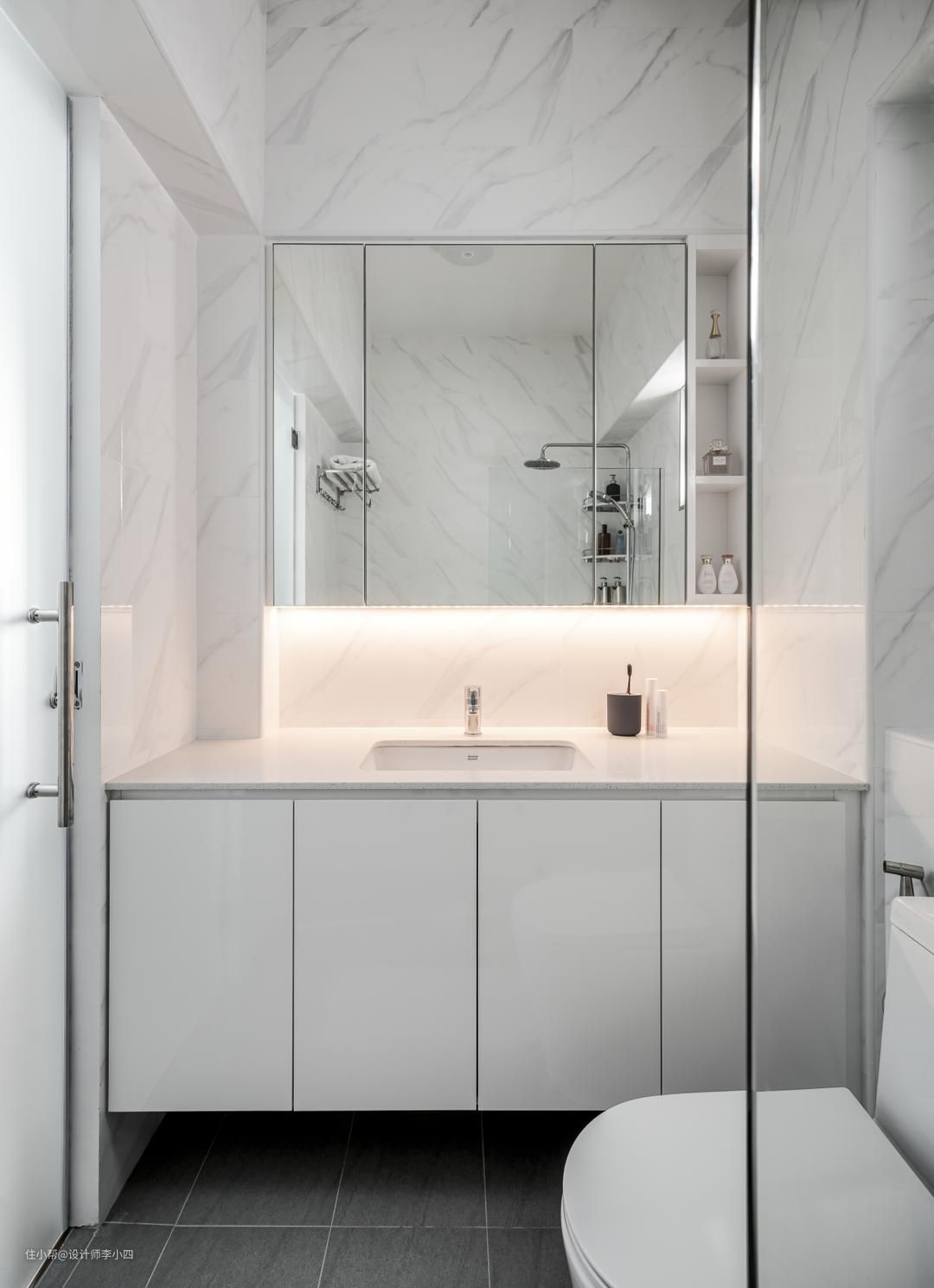 卫生间做简单的干湿分离。干区做镜面柜和悬浮浴室柜。白色的柜体和瓷砖墙面,保持空间明亮干净。镜面柜一侧留置物区,方便物品放置。柜体下安装灯带,带来柔和光线。