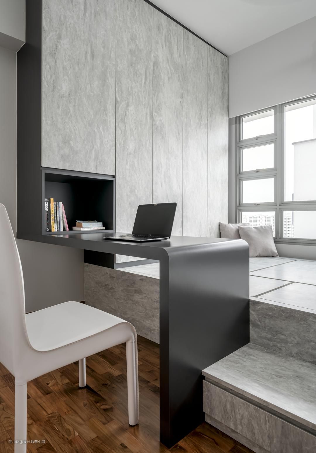 小卧室做榻榻米设计,节省空间,也满足大量收纳需求。衣柜、床、书桌一体设计,满足收纳、办公和居住等多种功能。灰色的柜体,简约大气。