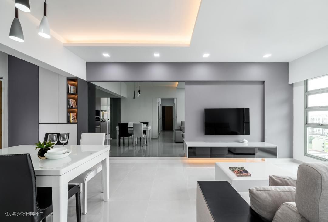 客厅天花板做半吊顶,安线性灯带和筒灯,为空间带来柔和采光。电视墙刷灰色乳胶漆,设计悬浮柜,一侧安装大块镜面,做壁龛置物,简单的布局让空间更显明亮。