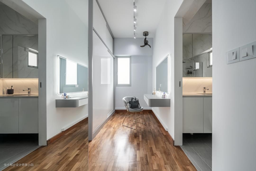 在主卫外设计一个小型衣帽间,地面铺贴木质地板,一侧做到顶衣柜,推拉式柜门,节省空间也满足衣物收纳。一侧有穿衣镜,方便衣物穿搭。