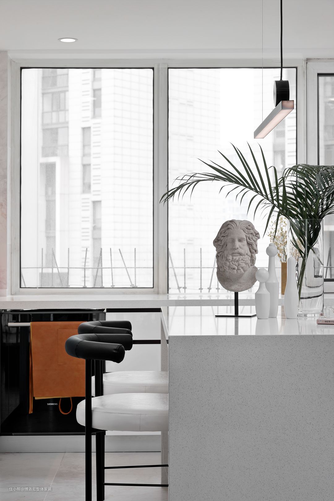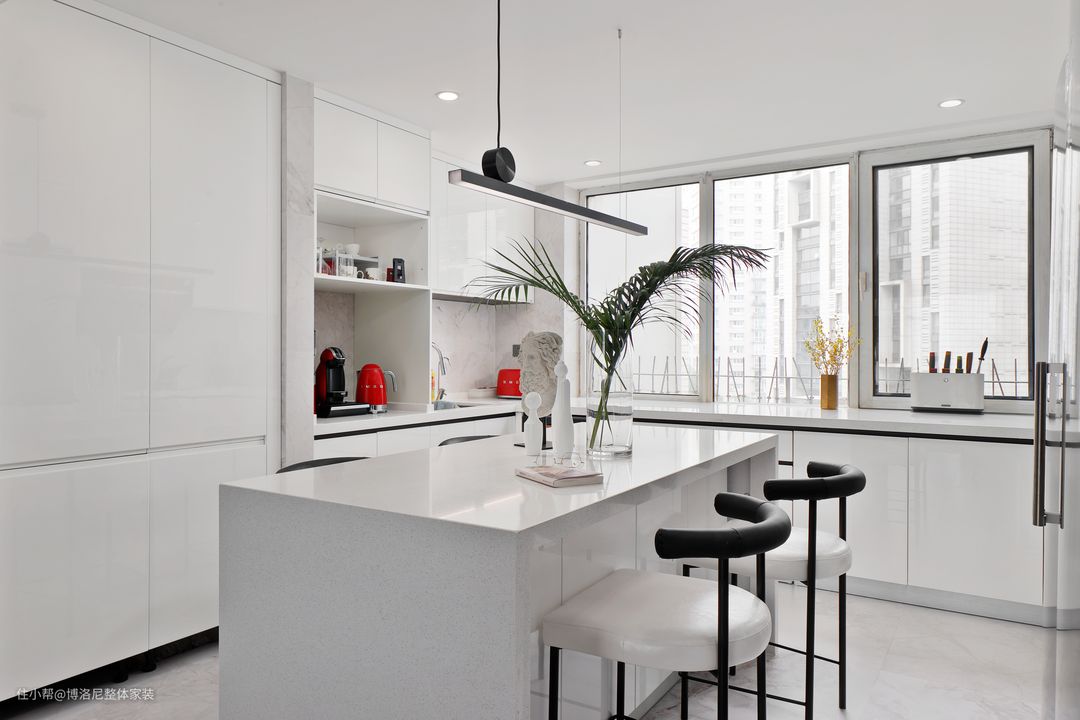 对于年轻人来说,开放式的厨房符合当代人的审美,白色橱柜、白色岛台,给人心灵上的美。极简的品质,尽在享受之中。