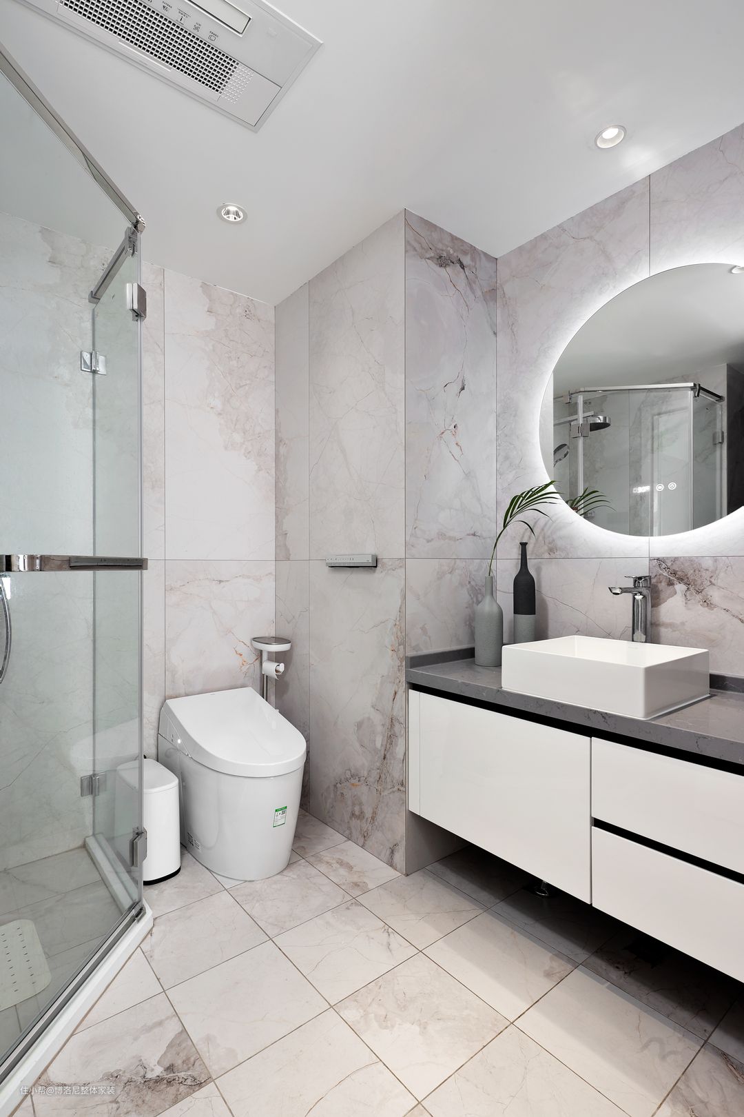卫浴间的设计,选用暖灰色调地砖为主,与卧室、厨房保持一致,石材元素的点缀,让整个空间更有艺术感。