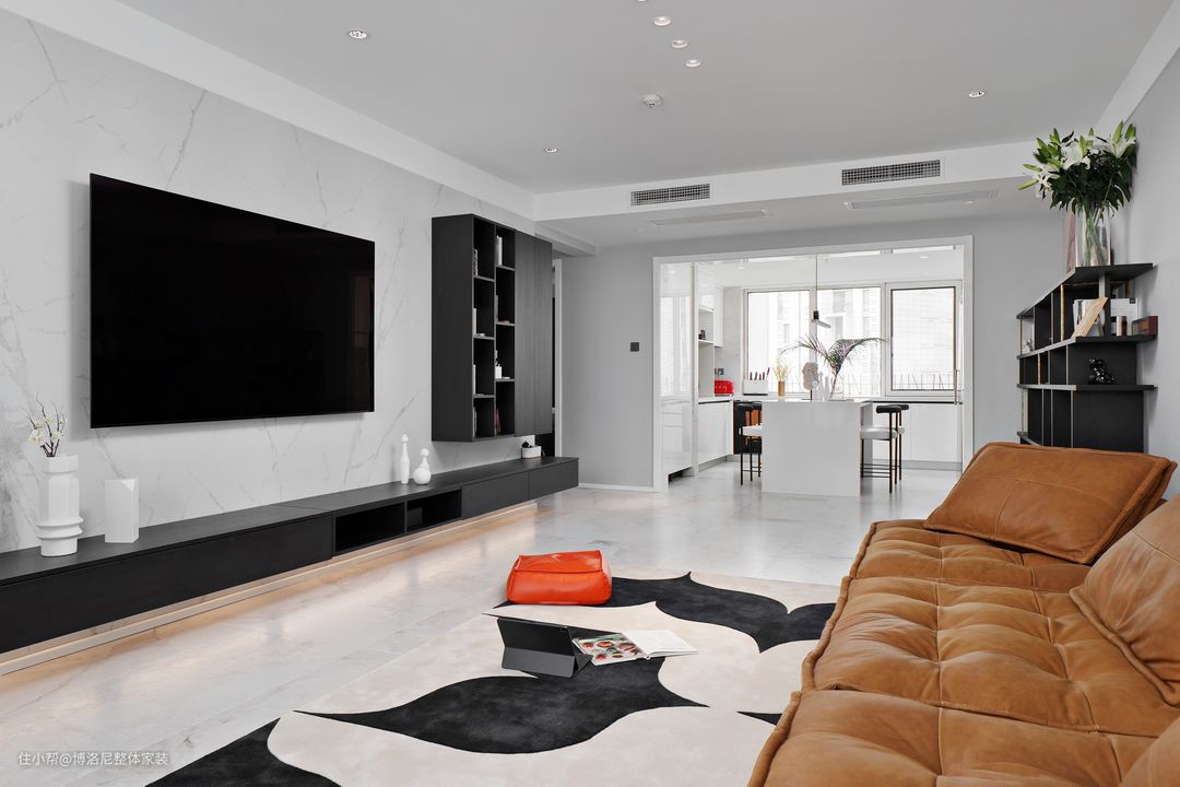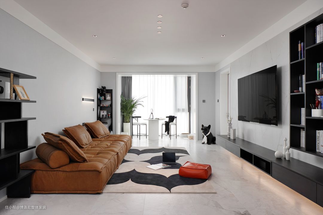 用设计来打造优雅生活,无论是材质还是色彩、软装的搭配,都充满美感。深咖色沙发格外的抢眼,也打破黑白灰空间的单调性。大理石背景墙,在视觉上形成艺术张力,瞬时打造一个时尚的现代家居。