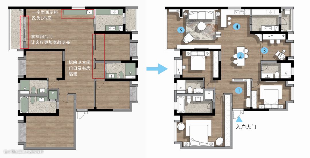 客厅改造前后对比,拿掉阳台门后,空间更加宽敞明亮。房子是精装修,我们保留厨卫内部结构和状态,用最省成本改造出最优化的格局!