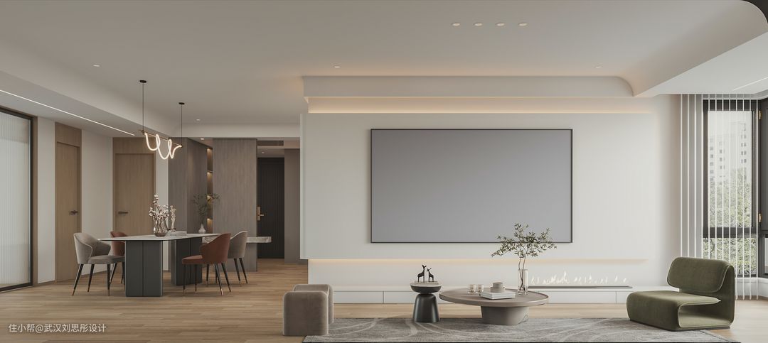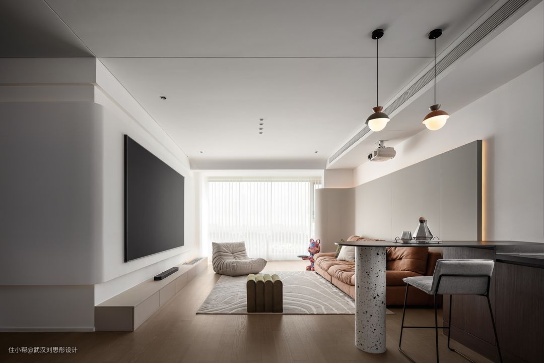 无主灯+大平顶让客厅更加宽敞大气,电视背景墙也做了悬浮设计,电视地台高16cm,并将雾化壁炉嵌入,同时增加功能性和美观性。