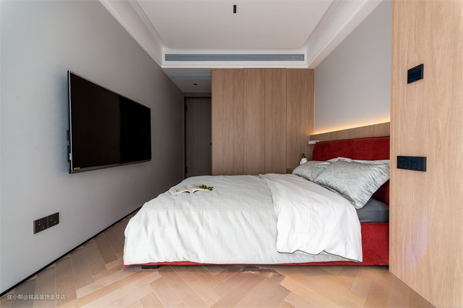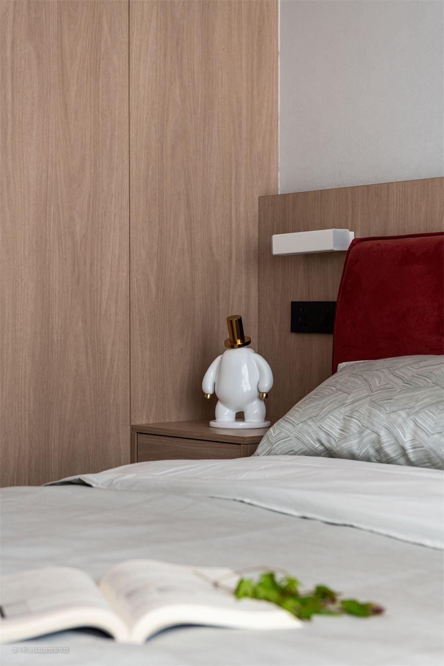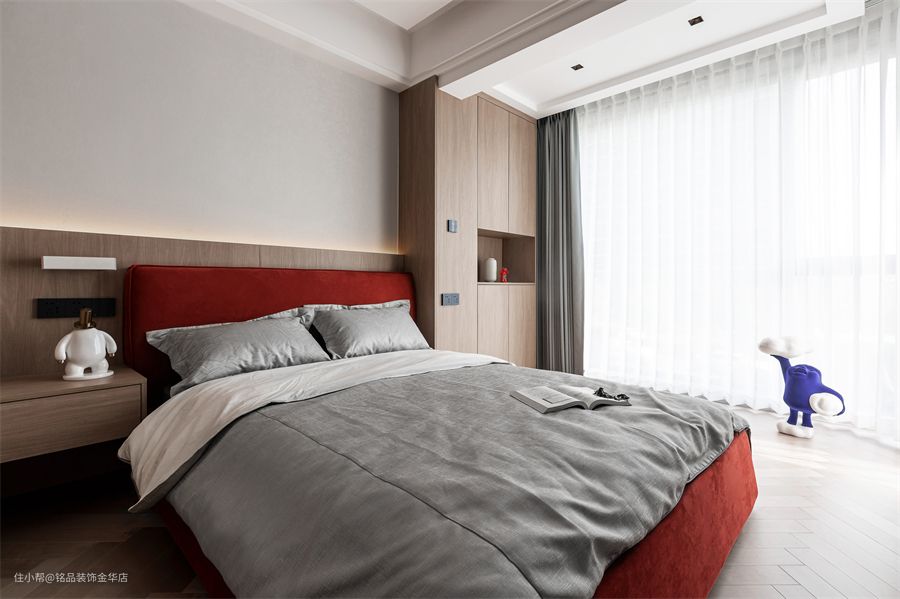 这间是父母房,床头墙做了灰色壁纸+原木的拼接,整体色调偏暗沉,床选择了亮眼的丝绒红床,沉闷单调的卧室一下就被点亮了,有种梦幻轻复古感。