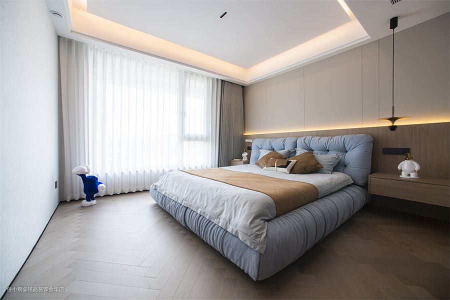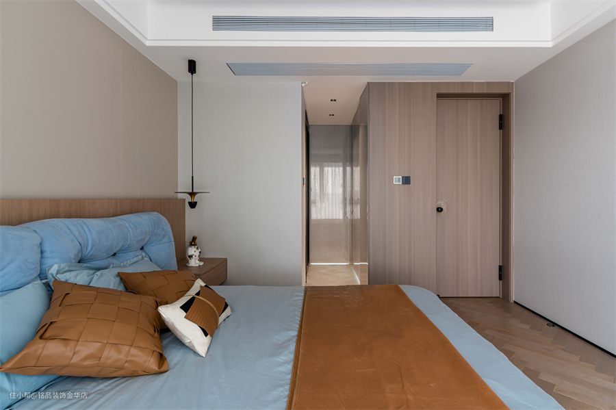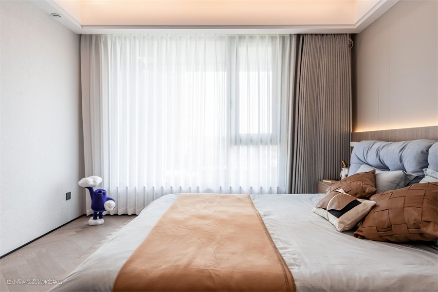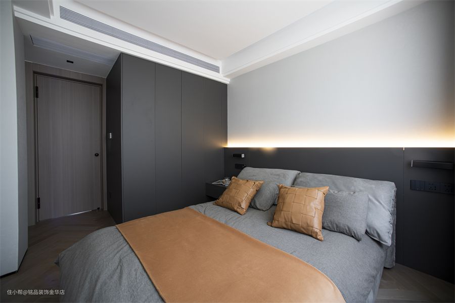 次卧的用途,姚女士准备当作客房,当家中来了客人时,需要一间体面又舒适的客房,这间设计有质感的次卧就挺适合,床品织物,格调氛围,都是舒适的商务风,有品位又有档次。