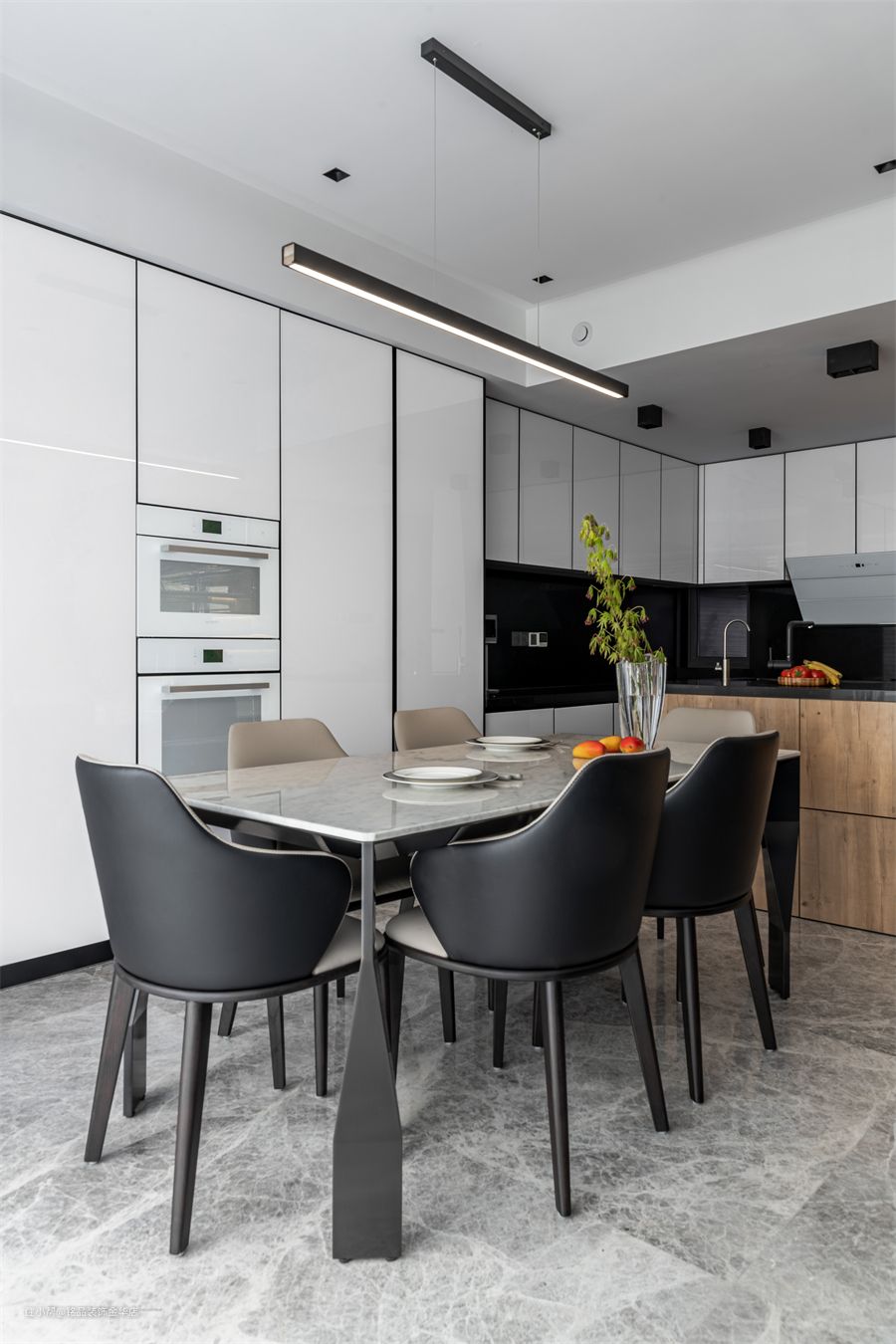 餐厅设计在了厨房与落地窗的中间,风格简约,美观时尚,这里的设计姚女士非常喜欢,与厨房的距离非常近,一家人用餐时间,围坐在一起,感受温馨亲密的气氛,其乐融融。