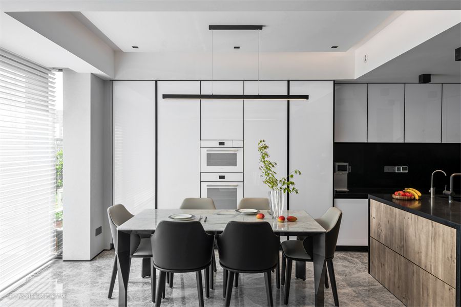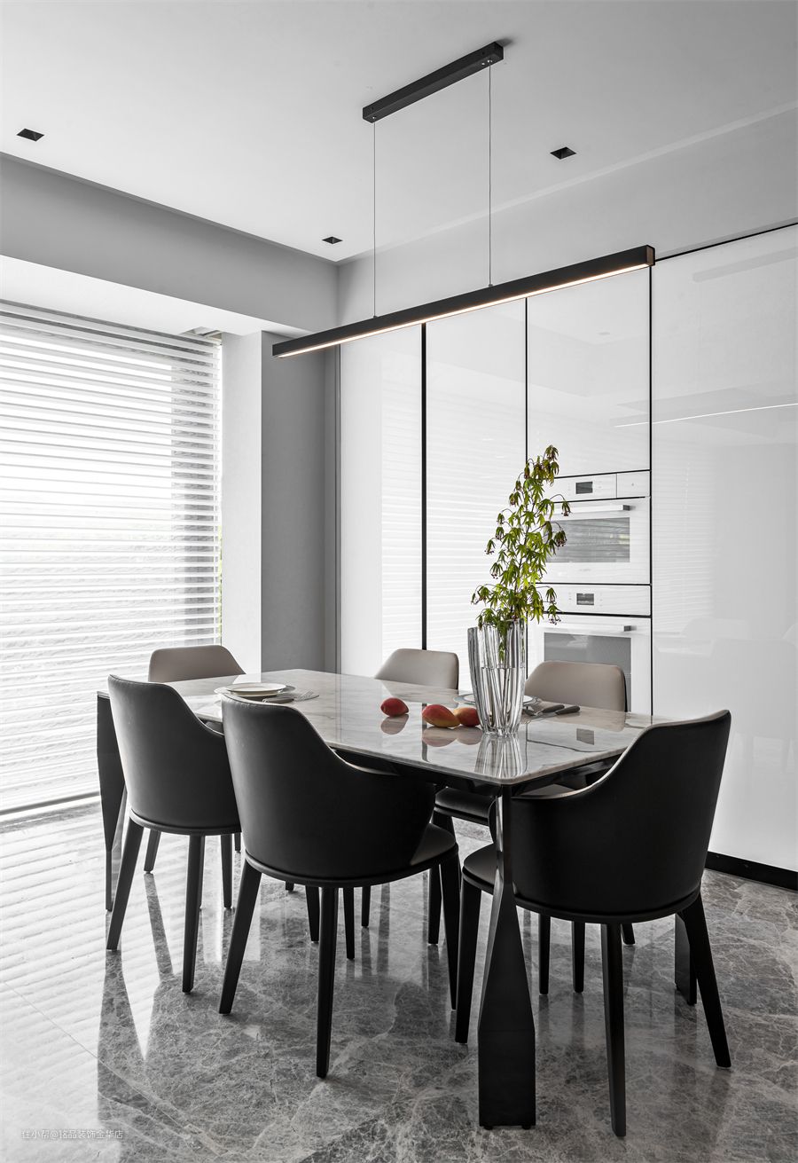 餐边柜和橱柜做了衔接,统一的闭合式白色柜门,让空间更显简洁。