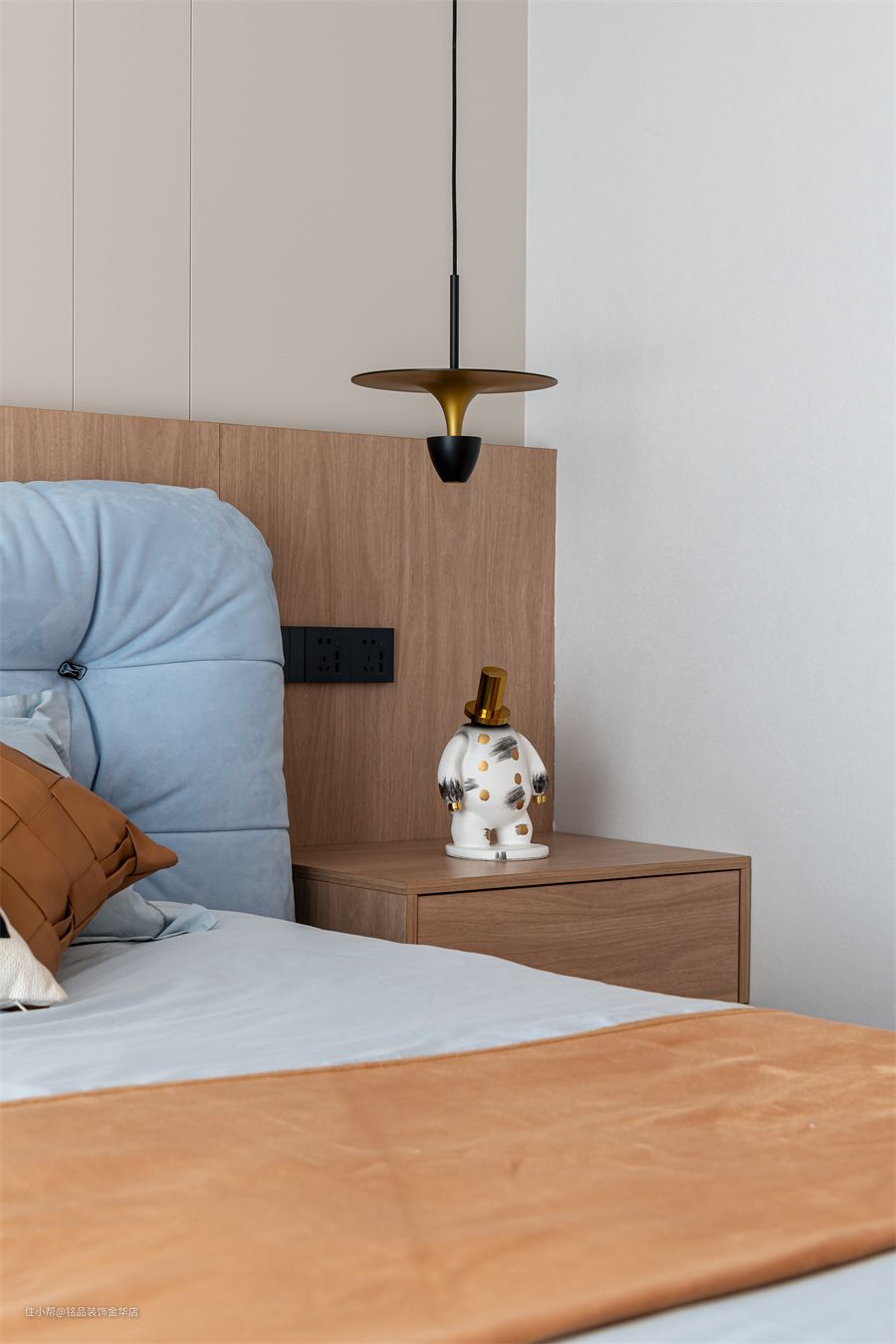 床头背景墙透着舒适感,硬包拼接木饰面,大地色与原木色的结合,温温柔柔。丰富层次感的同时,灯带营造温馨氛围。
