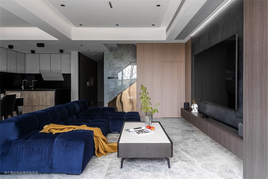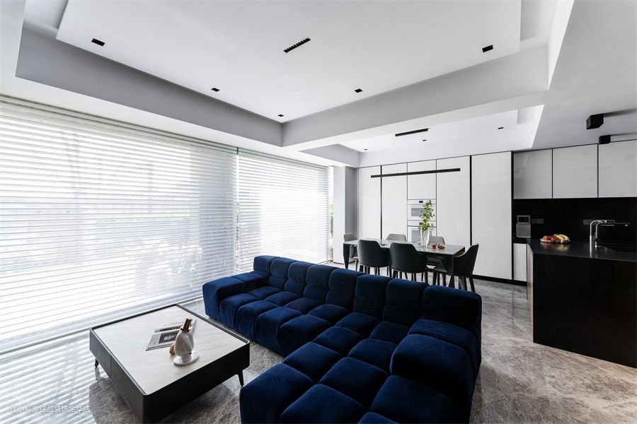 新居室的客厅,非常宽敞舒适,开阔型的空间,一眼望去,就能将整片客厅空间收入眼底,简白色的主基调,素净又合眼,搭配群青色的定制沙发,生活的舒适感妥帖到位。