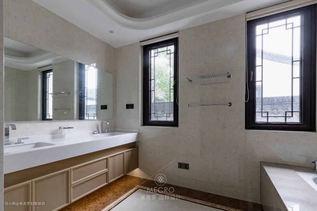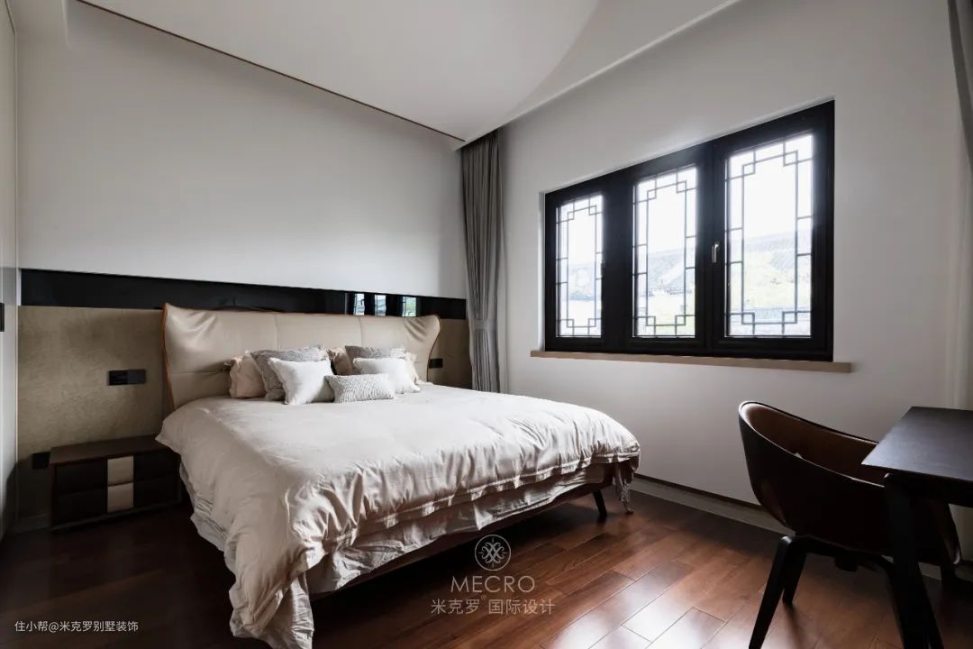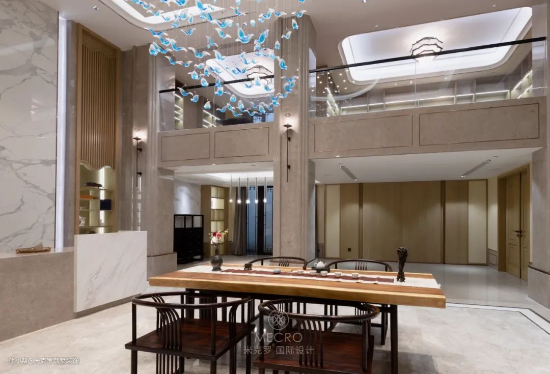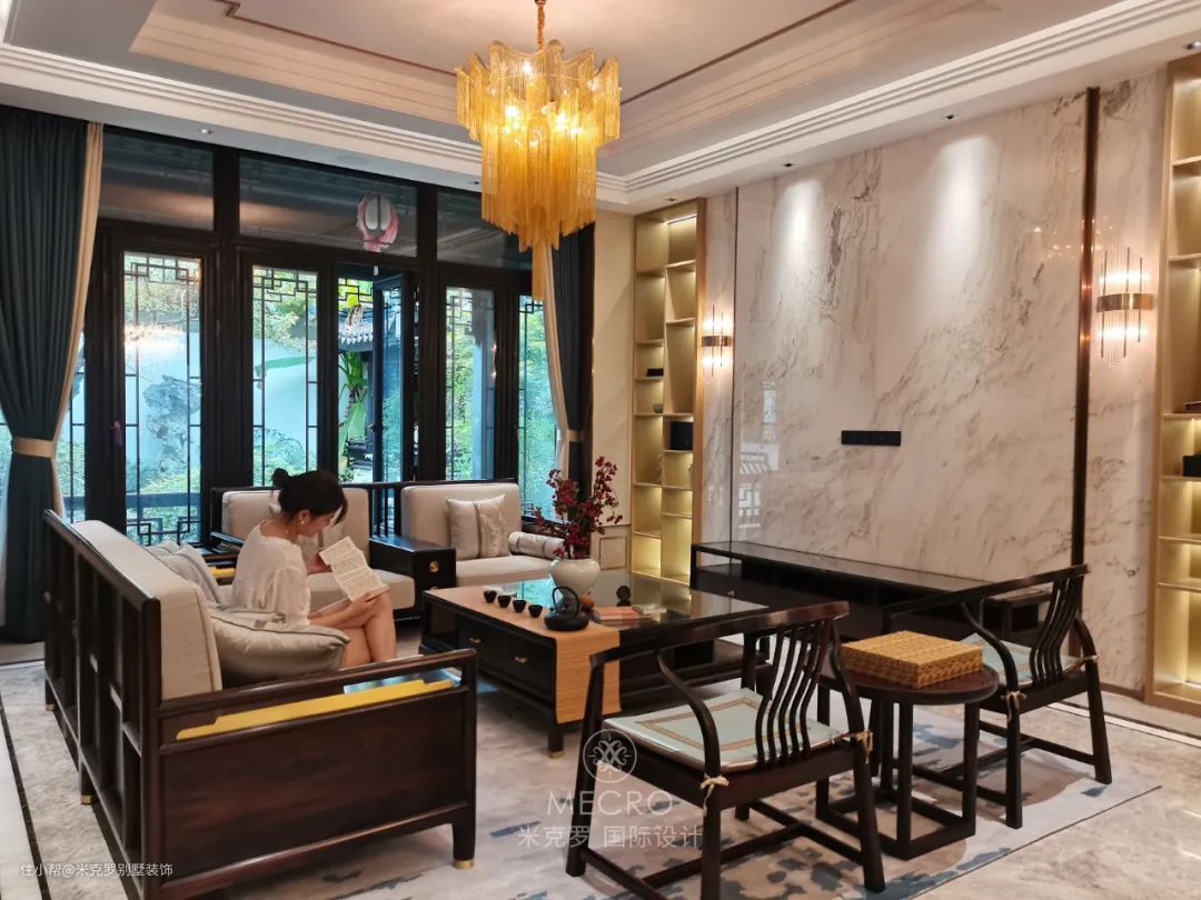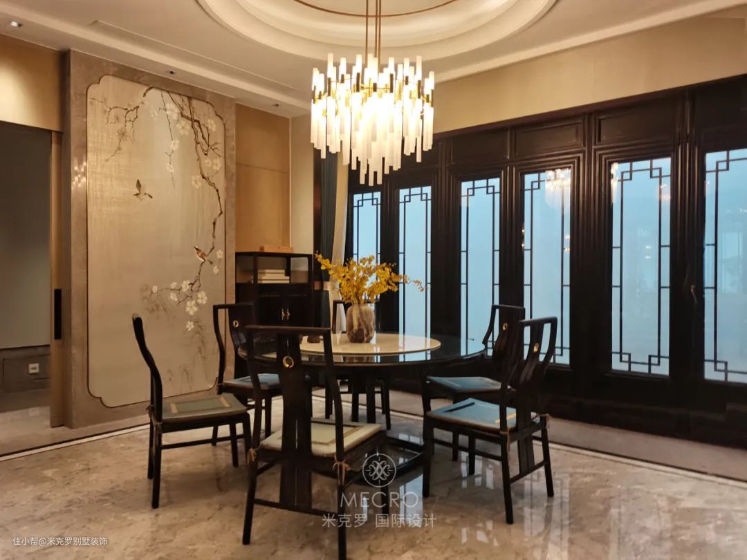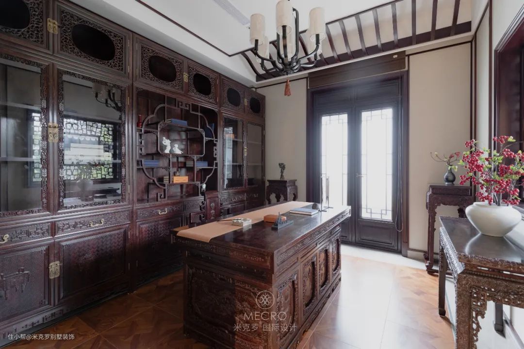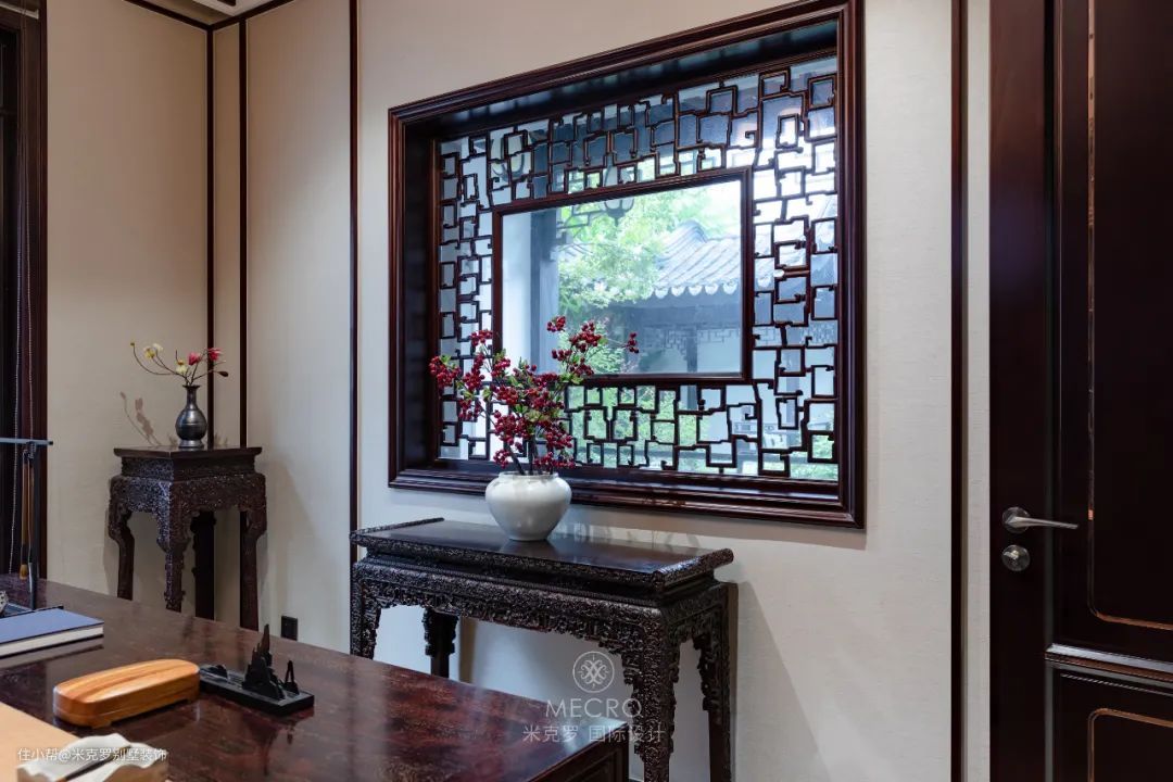 一楼书房的设计是整套住宅的灵魂所在,灵感源于苏式园林里的碧梧栖凤馆,通过苏式镂空花窗来取景,意为主人打造有传承意义的归隐居所。