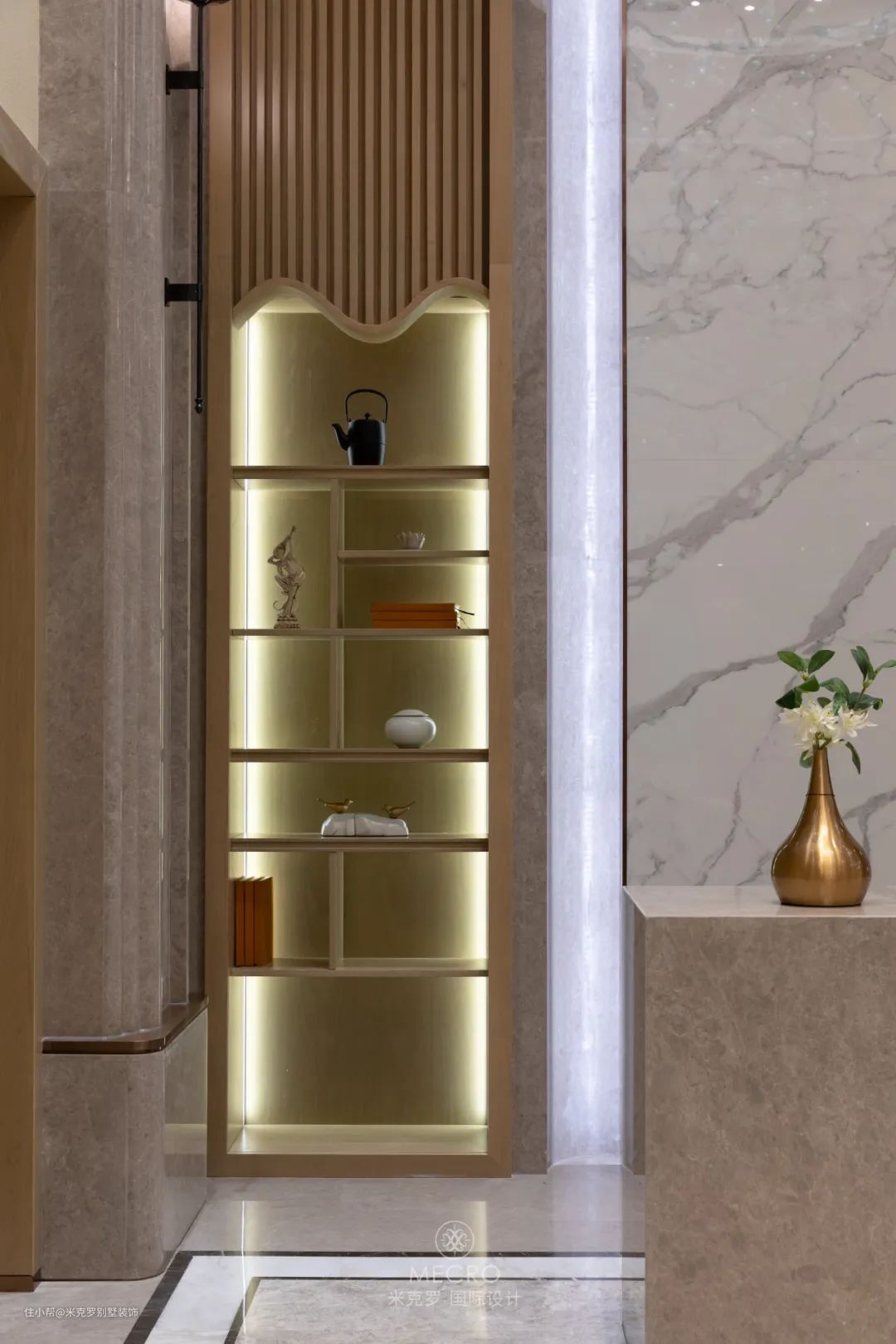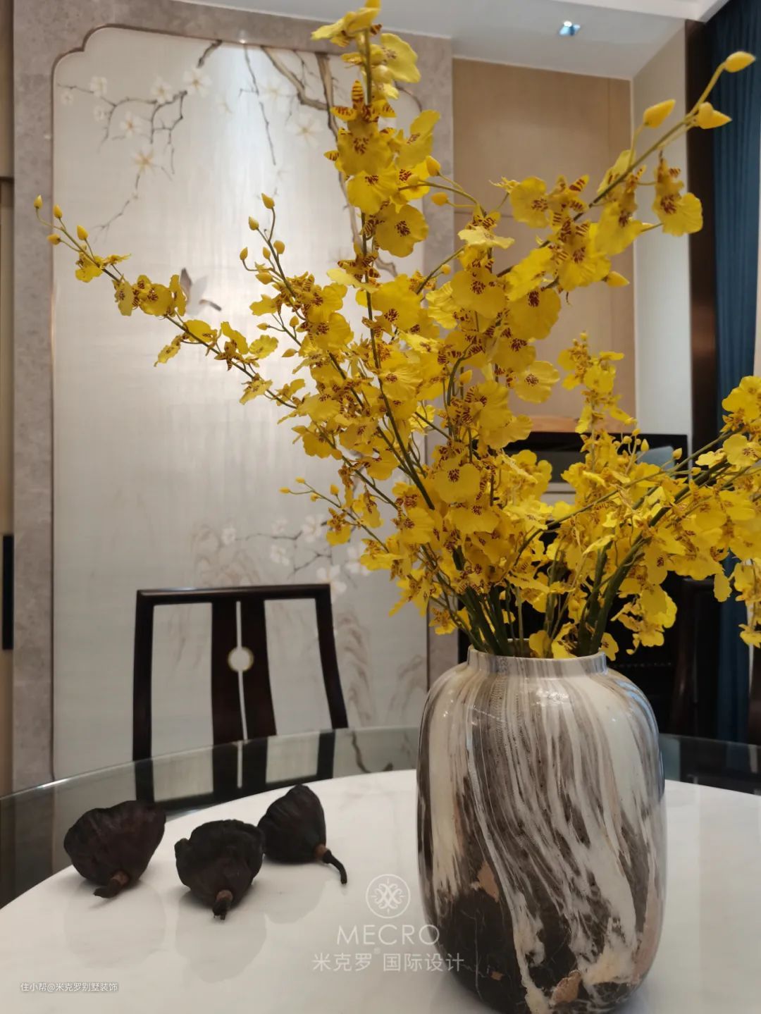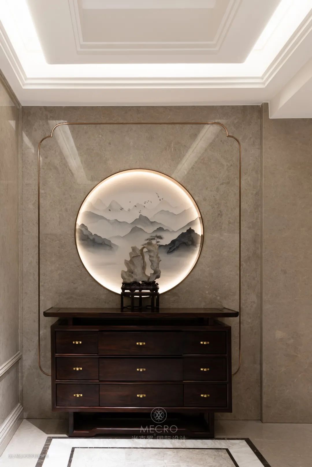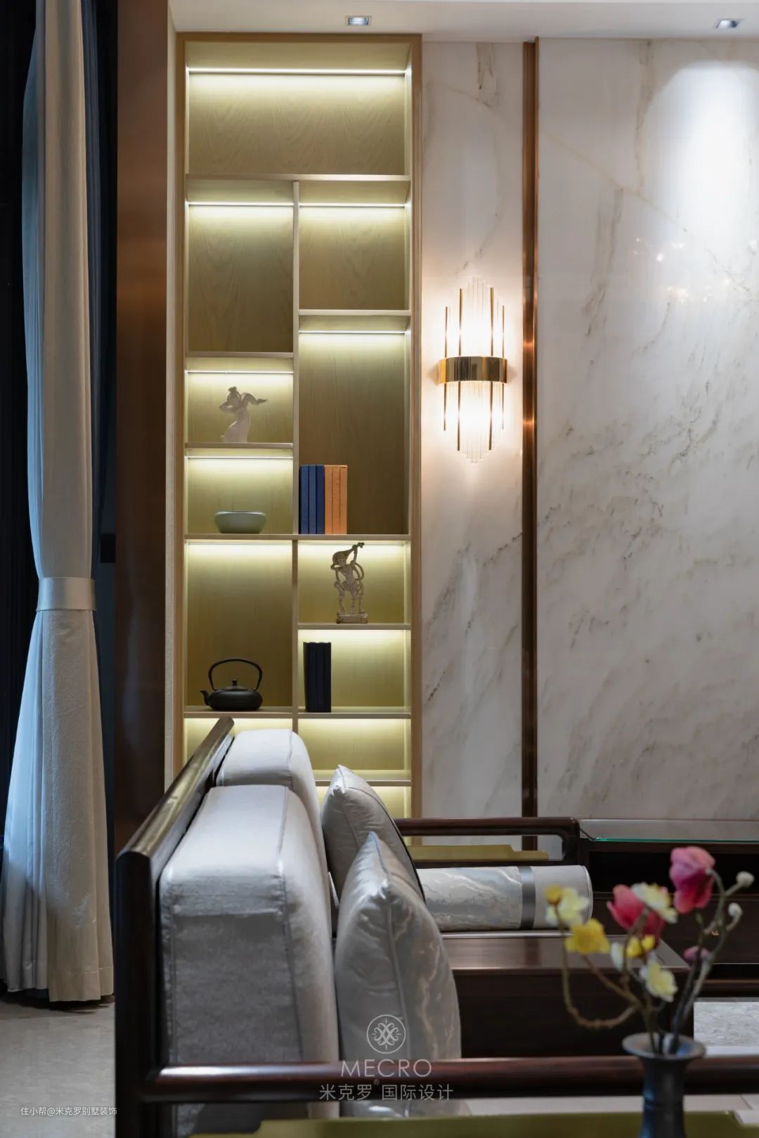 客厅空间将中式山水,苏绣工笔,太湖石工艺品巧妙的融入其中,金色线条的勾勒,聚焦空间的视觉点,在沉稳的空间中增加了一丝浪漫和灵动。