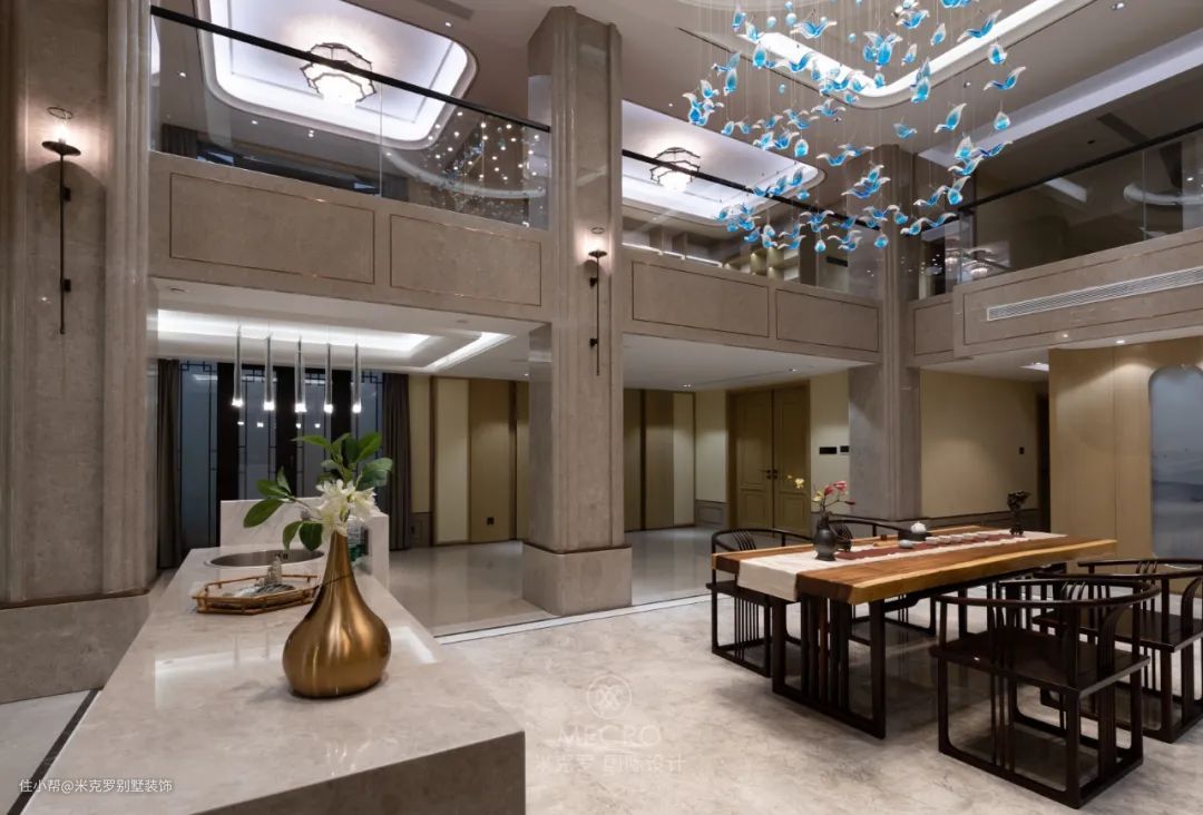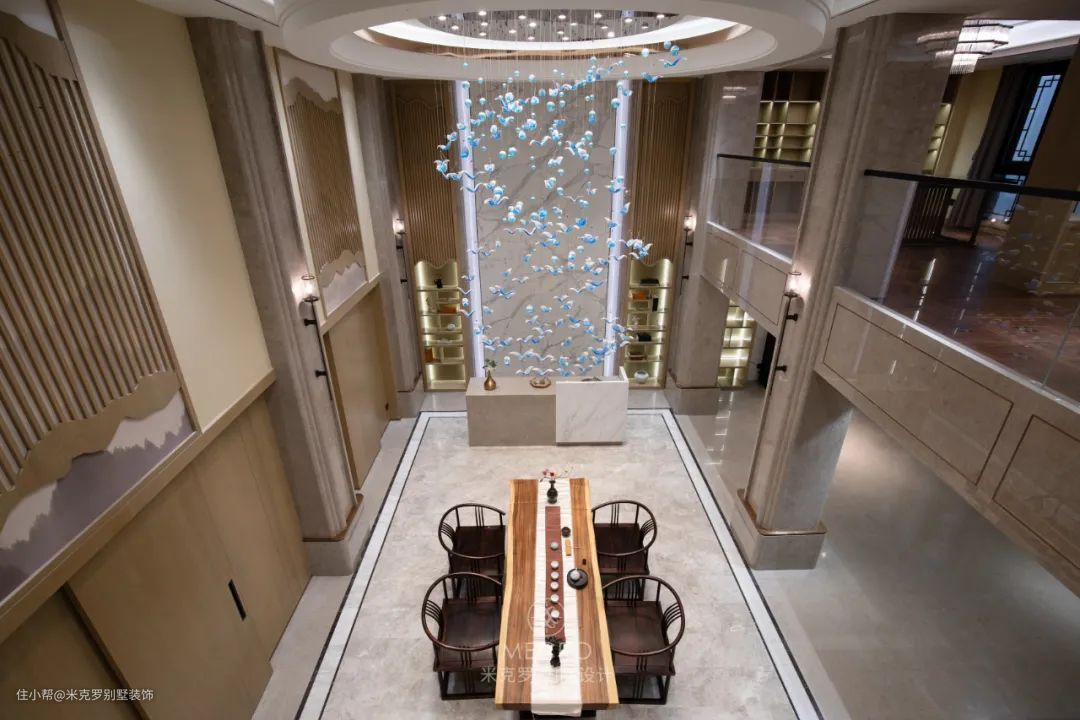 地下室里的茶室是本案亮点,挑高的设计让整个地下室的活动空间更加宽敞而大气,空间突出了立柱的装饰效果,以中式如意造型收口处理,让整个空间更加圆润柔和。