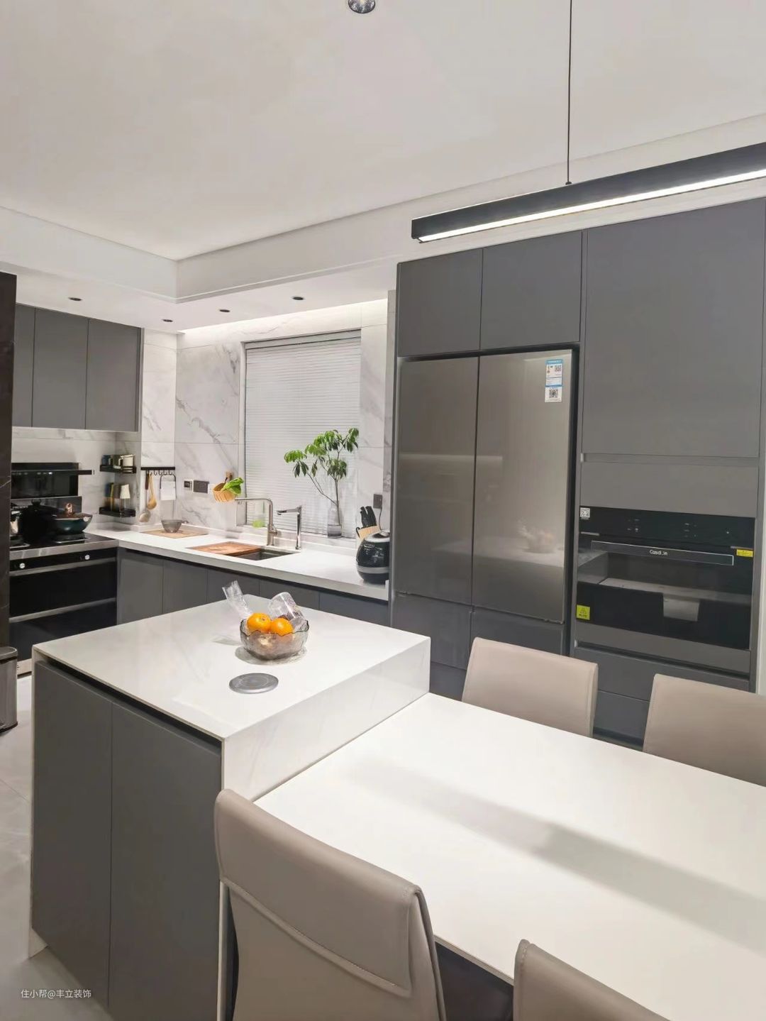 为了后期好清理,果断选择了灰色为橱柜的主色系,橱柜门的模压工艺比肤感膜容易打理,不会留指痕。