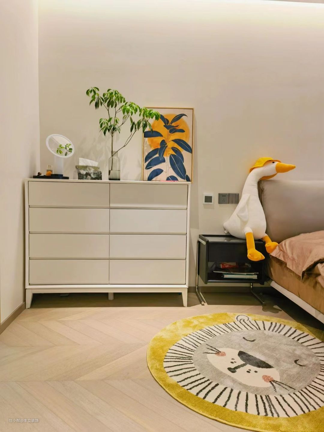 床头柜旁边放置了白色斗柜,不仅增加了卧室的收纳空间,同时也能摆放一些装饰品,提高空间精致度、美观度。
