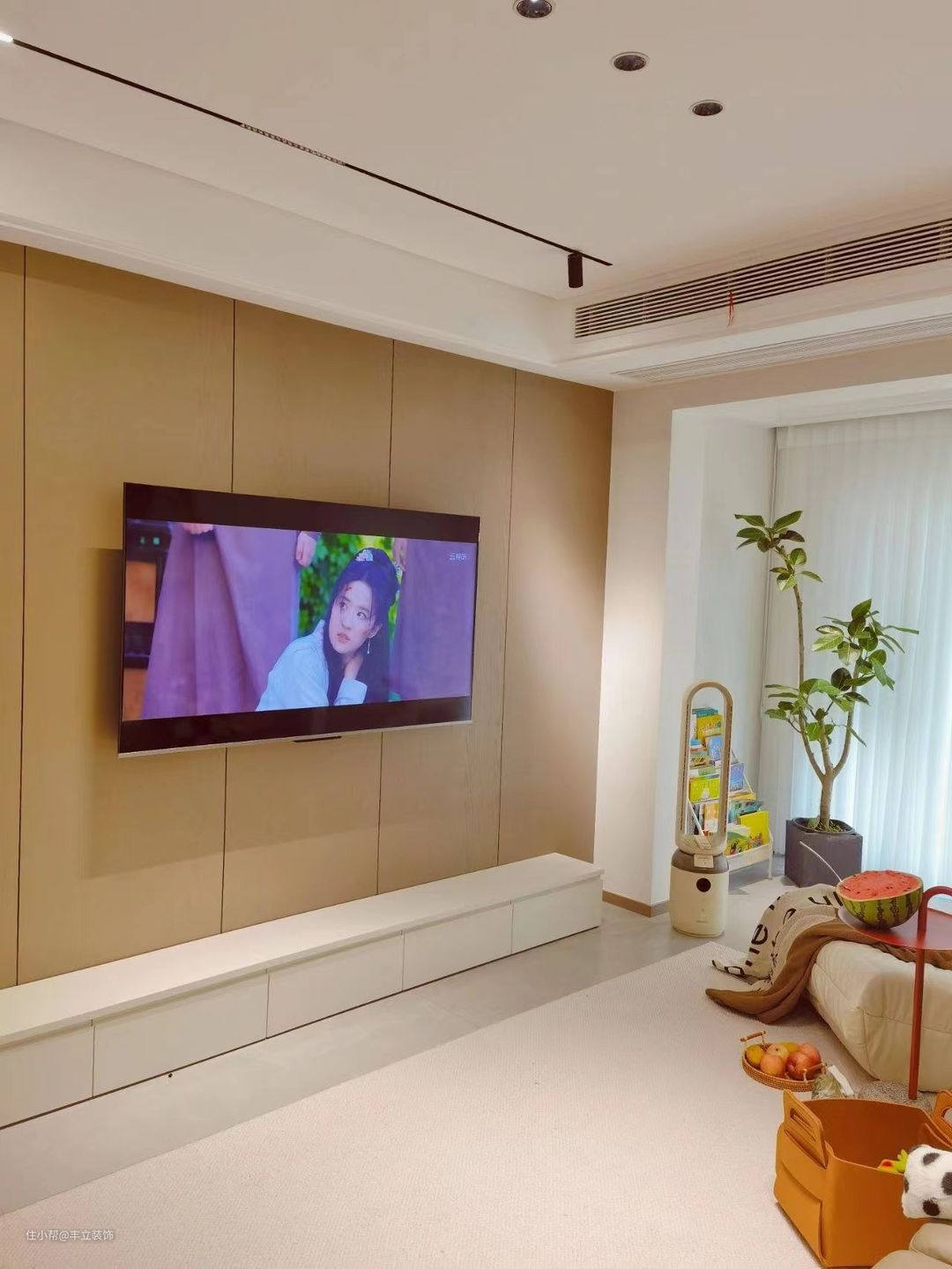 电视背景墙,设计师摒弃了简约风经常用到的岩板,而是选用了更具包容性与温润感的木饰面,更显柔和。同时,在顶面上安装了一个可调节角度的射灯,在光影勾勒与空间氛围上营造出独特美感。