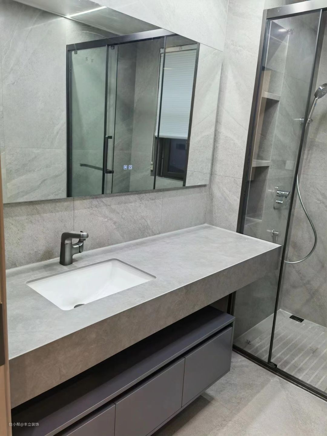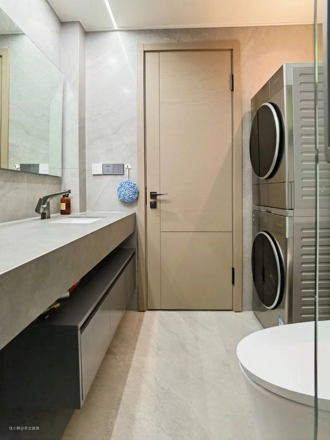 卫生间整体偏意式极简风,灰色更显质感。做了1.6米岩板台面,植入了一个迷你洗衣区,偶尔手洗衣服也很方便,洗衣、烘衣,都在一起,动线清晰,使用便捷。