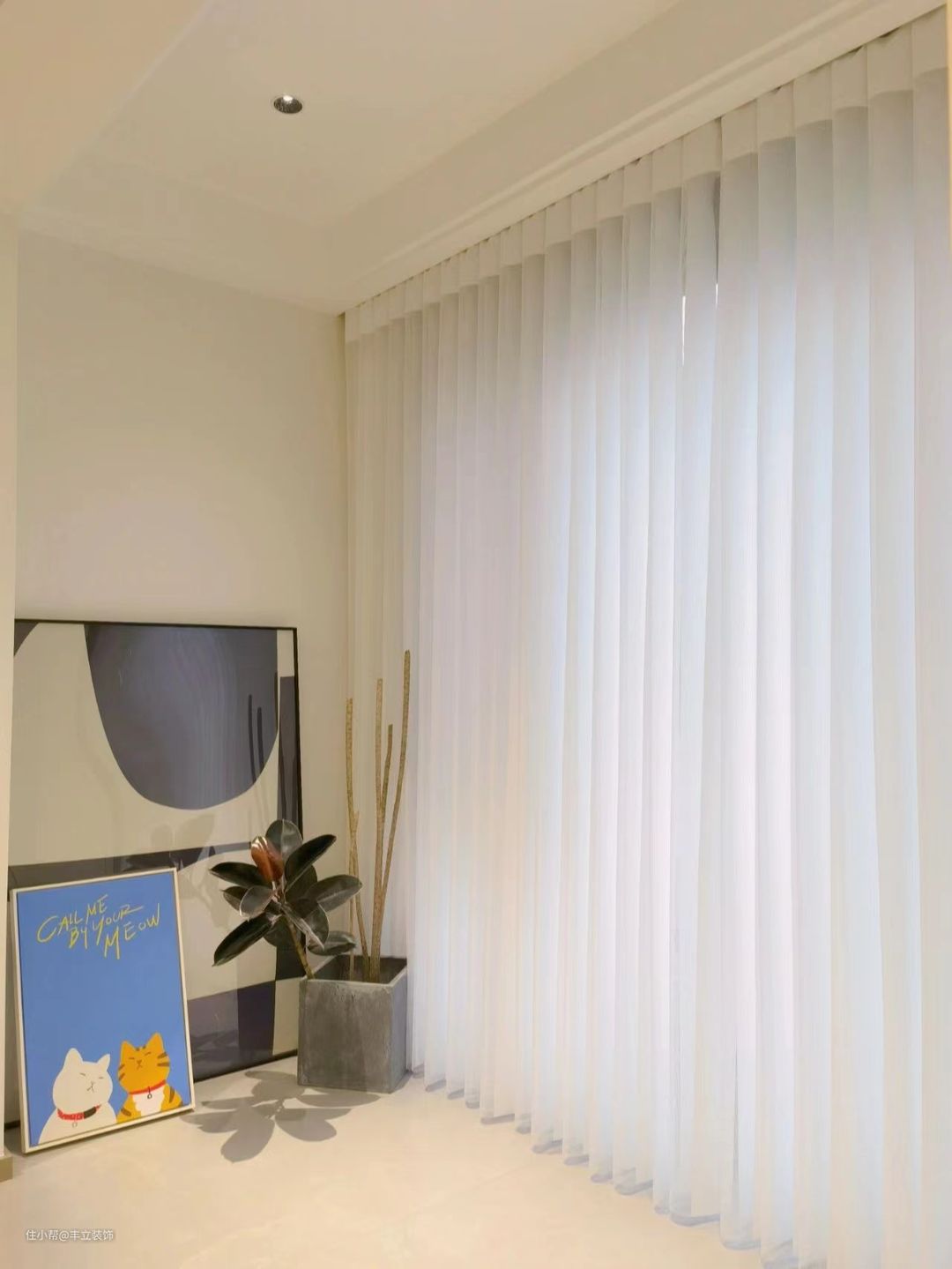 客厅秉承轻松无负担的原则,没有厚重的造型吊顶,仅在周围做一圈石膏线条点缀,顶面无主灯设计,视觉上拉伸空间,立面刷白色艺术漆,营造出随性自在的氛围感。地面选用150*75浅灰色大砖通铺,接近色彩砂填充,视觉上更具有统一性。瓷砖材质选用柔光砖,比哑光砖更好清理,不容易留水痕,且比较耐脏,有灰尘也看不太出来。