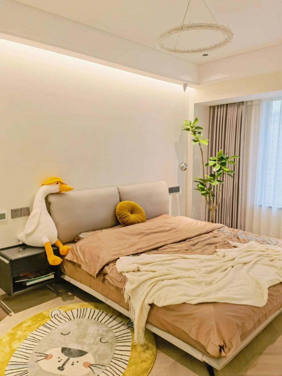 卧室长5.1米,宽3.3米,床1.86宽×2.06长,尺寸适中。卧室整体氛围是是轻松而明快的,大面积的留白墙面,配色暖色灯光的渲染,阳光透过纱帘潜入室内,烘托出温馨静谧的睡眠气息。鱼骨拼地板极具质感,错落有致的图形细节,赋予空间强烈的立体感。